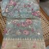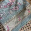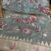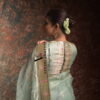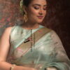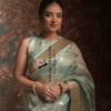 The saree in the image is a soft pastel green shade with a lustrous, sheer texture, likely crafted from tissue fabric . It features paithani border with allover polk dots, adding a touch of elegance. The standout element is its wide zari border in gold, embellished with grid patterns and pink thread accents, ending in rich tassels that enhance the traditional charm. Paired with a matching sleeveless blouse..