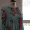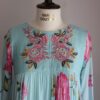 This elegant dress comes in a soothing pastel blue shade, exuding a calm and refreshing vibe. It features soft floral prints in shades of pink, green, and yellow.The bodice is adorned with intricate floral embroidery enhanced by sequins for a subtle shimmer.