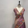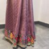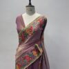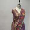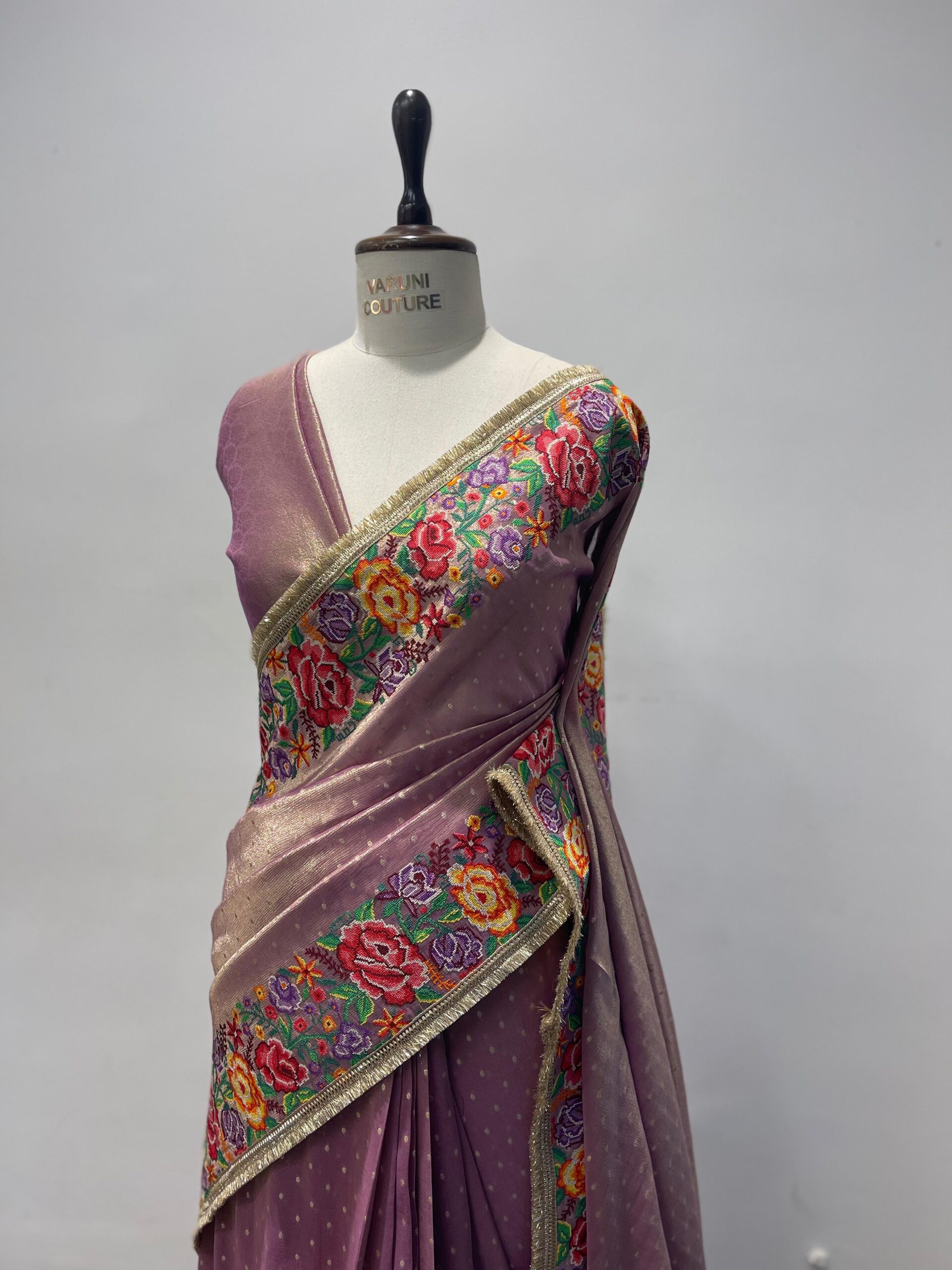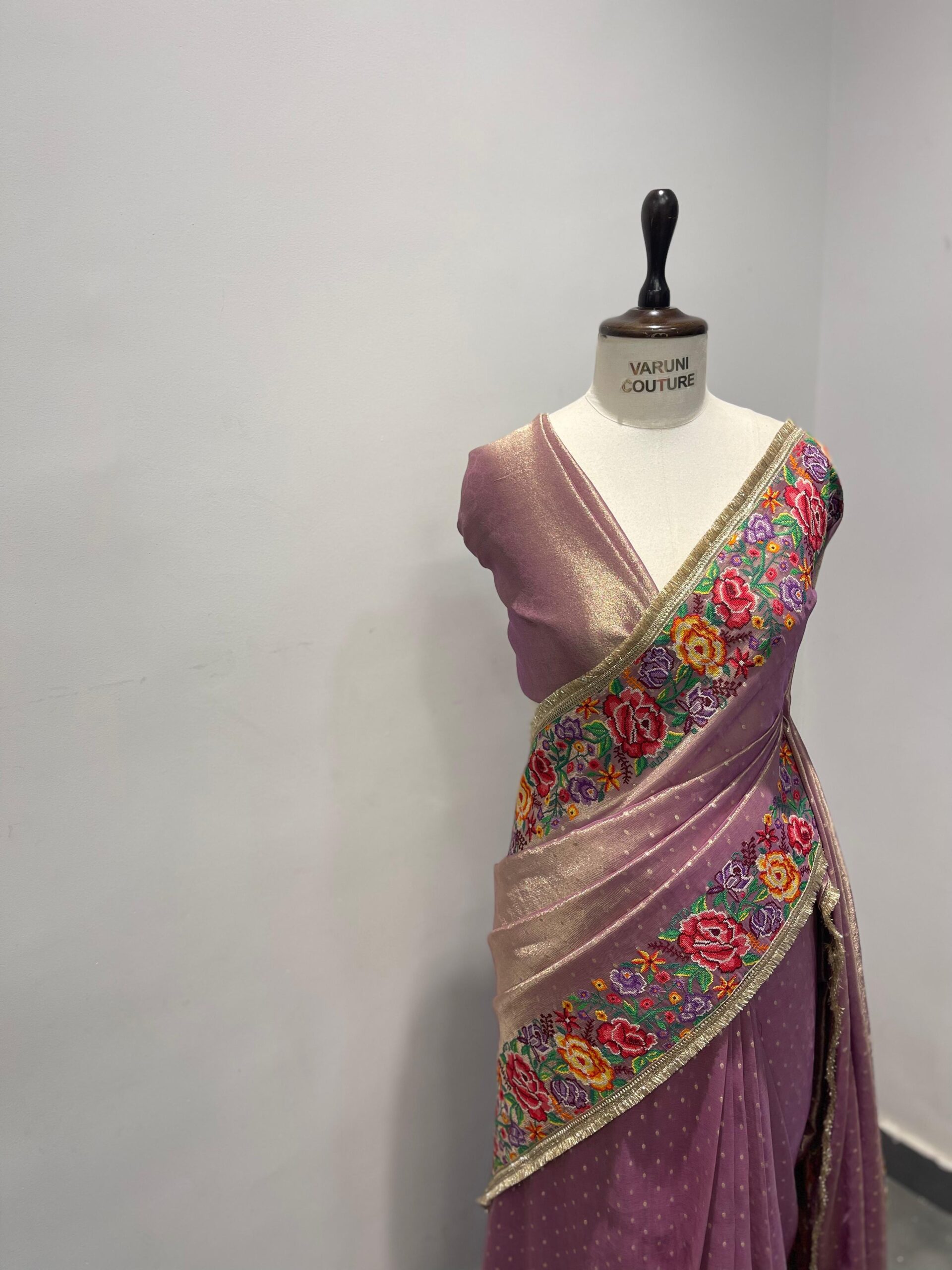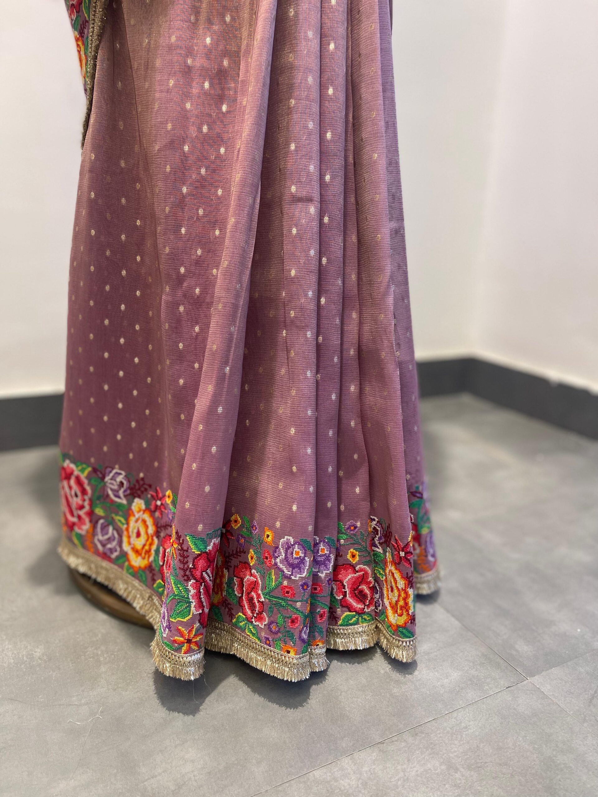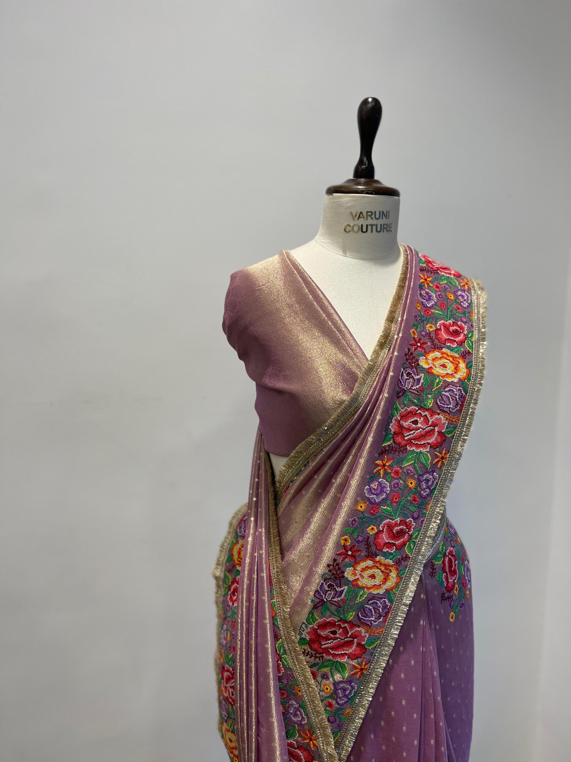 A vibrant purple tissue brocade Saree that drapes like a dream comes with a running blouse as Saree with petite point embroidery work for sleeves.