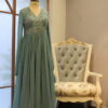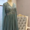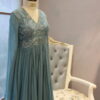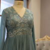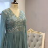 This azure blue long gown features intricate silver or white floral embroidery on the bodice. It has a deep V-neckline with sheer full-length sleeves for an elegant touch. The flowy pleated fabric creates a graceful silhouette, perfect for special occasions.