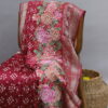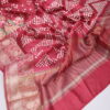 An exquisite Chanderi Bandhani saree crafted for timeless elegance, featuring intricate petit point artistry delicately highlighted on one side of the saree. The flowing drape is enhanced by a beautifully detailed, statement pallu that exudes regal charm. Paired with a refined plain blouse, elegantly finished with a rich zari border on the sleeves, this saree is a perfect blend of heritage craftsmanship and understated luxury—ideal for festive occasions and refined celebrations.