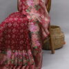 An exquisite Chanderi Bandhani saree crafted for timeless elegance, featuring intricate petit point artistry delicately highlighted on one side of the saree. The flowing drape is enhanced by a beautifully detailed, statement pallu that exudes regal charm. Paired with a refined plain blouse, elegantly finished with a rich zari border on the sleeves, this saree is a perfect blend of heritage craftsmanship and understated luxury—ideal for festive occasions and refined celebrations.
