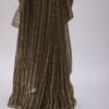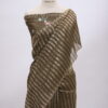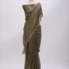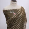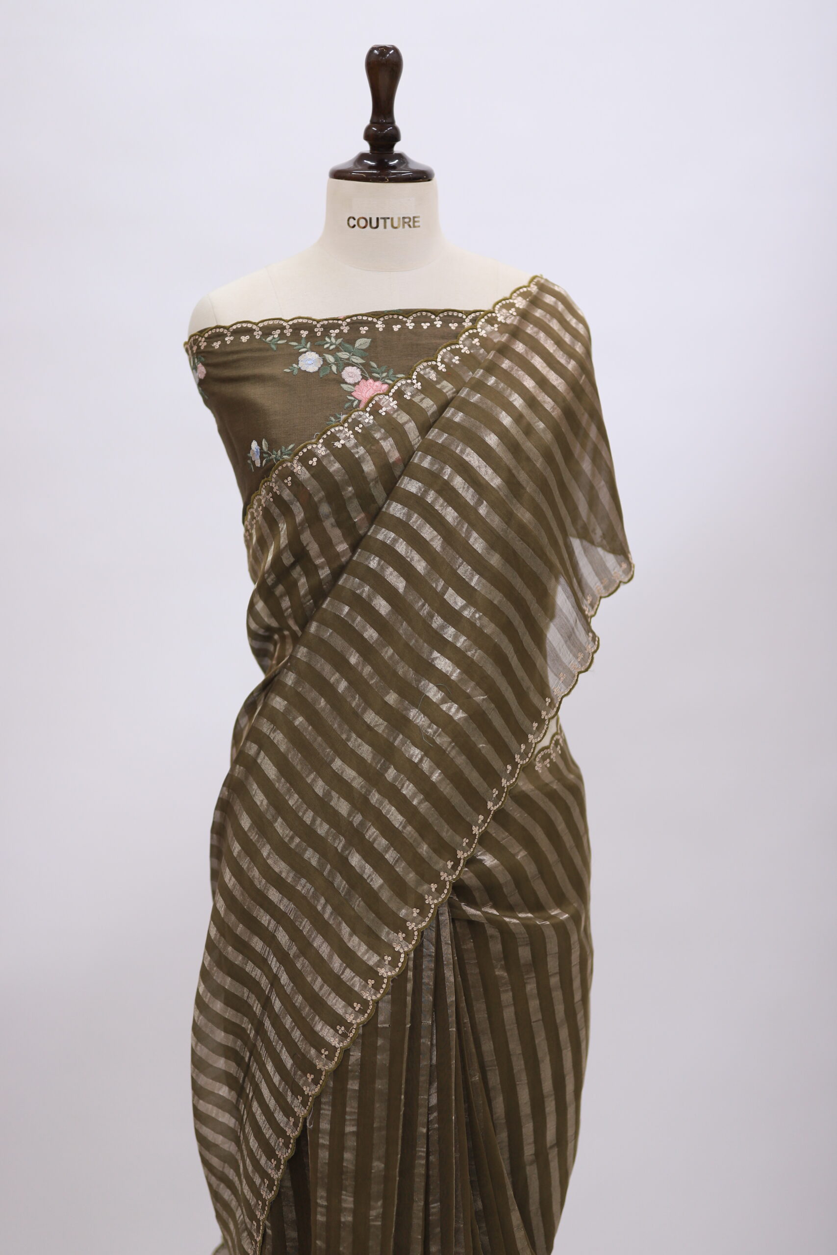 A graceful pure Chiniya silk saree crafted with delicate tissue strip weaving, giving it a soft sheen and fluid drape. The saree is beautifully finished with handworked sequin scallop edging on all four sides, adding a subtle festive sparkle. Paired with a rich raw silk blouse adorned with intricate floral thread-work embroidery, this ensemble blends contemporary charm with traditional elegance—perfect for occasions that call for understated luxury.