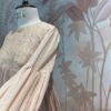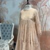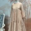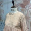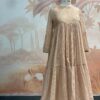 The “Behr Apple Core” dress is a soft beige shade, exuding timeless elegance. Its bodice features delicate floral embroidery, adding a refined touch to the minimalistic design. Crafted from lightweight Kota cotton, the fabric drapes beautifully in a tiered, flowy silhouette. The sheer, full-length sleeves with ruffled details.