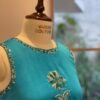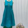 This elegant outfit features a bright blue sleeveless dress with delicate floral embroidery on the chest and neckline, adding a charming touch. Paired with green pants that have playful blue polka dots, the ensemble creates a vibrant and stylish look.