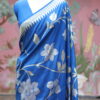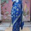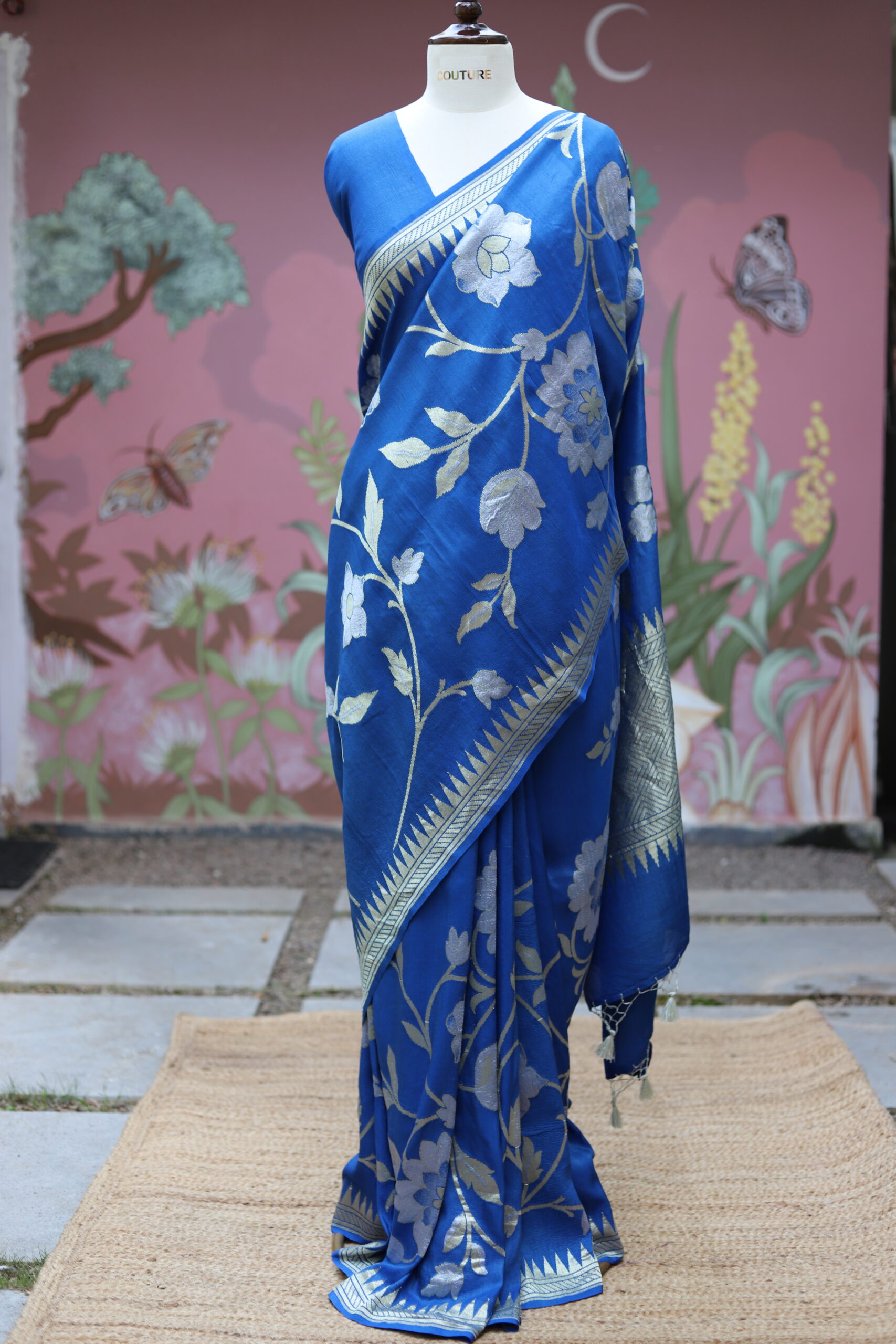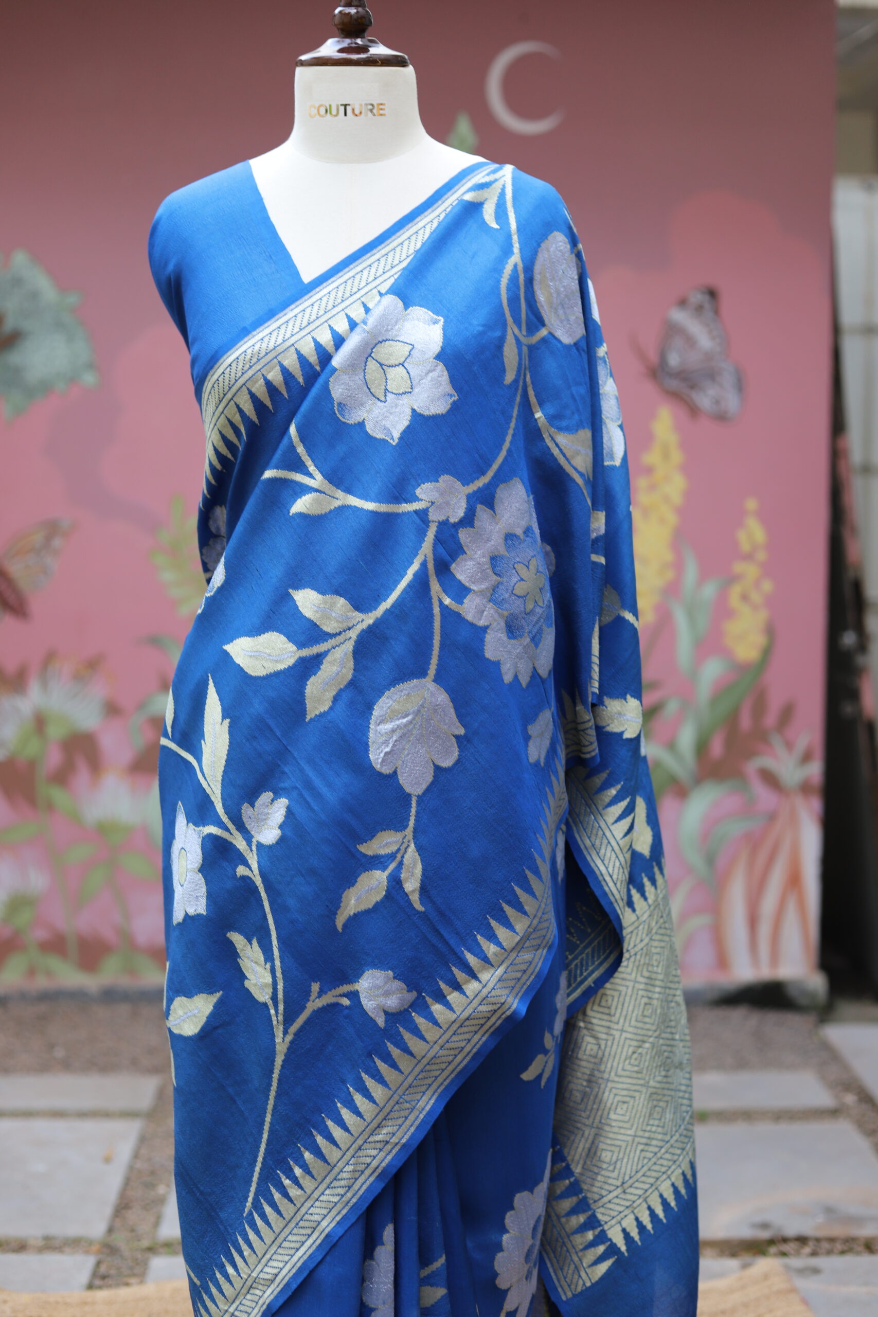 Pure tussar silk saree intricately woven with allover meenakari detailing in mixed gold and silver zari. The saree features an elegant mountain-inspired design along the edges, adding a rich traditional touch. The blouse comes in plain tussar silk with a delicate zari border for the sleeves. Perfect choice for weddings, festive occasions, and poojas.