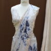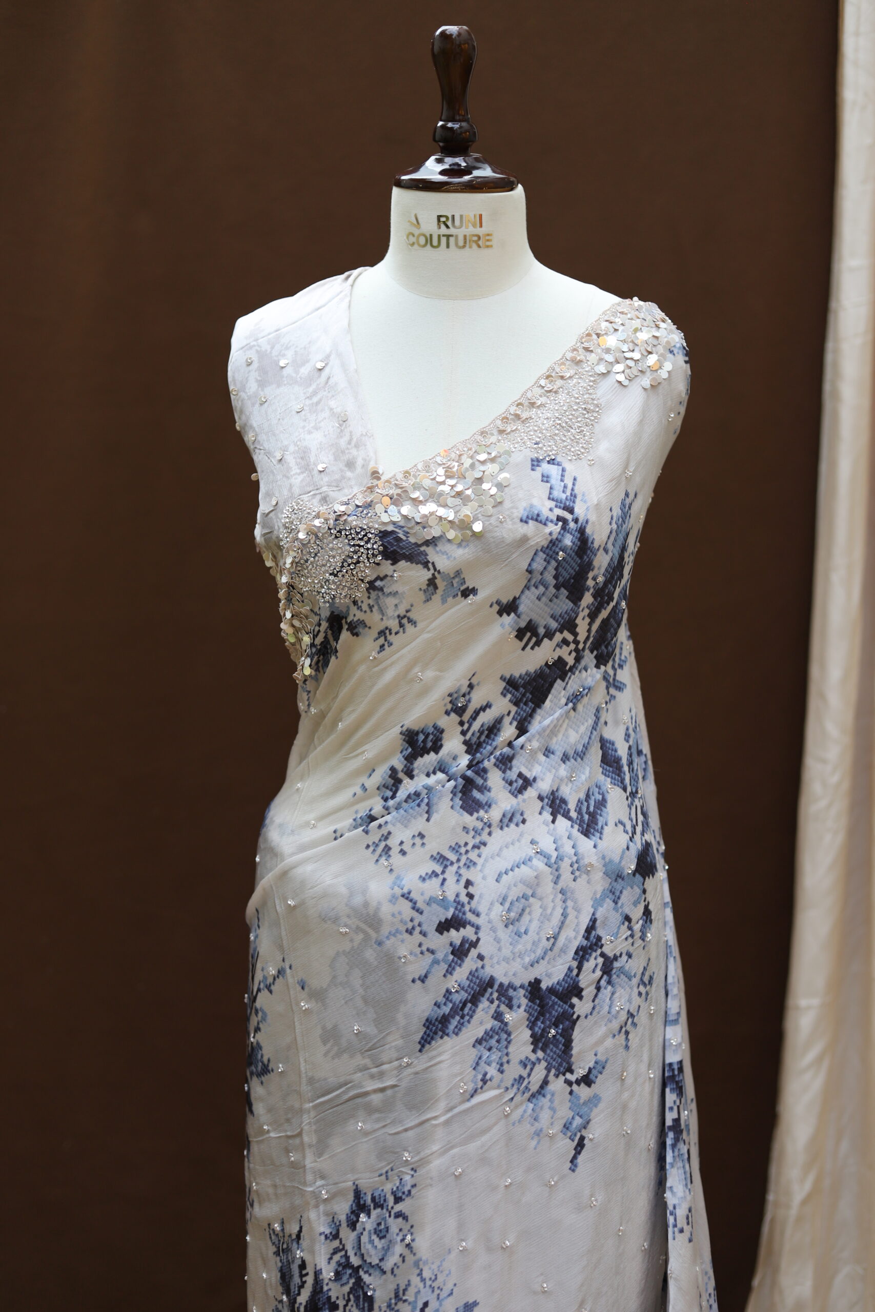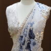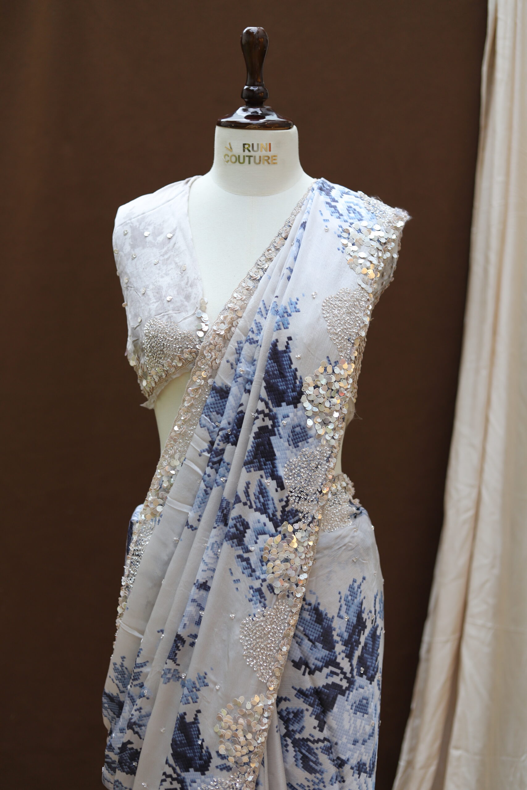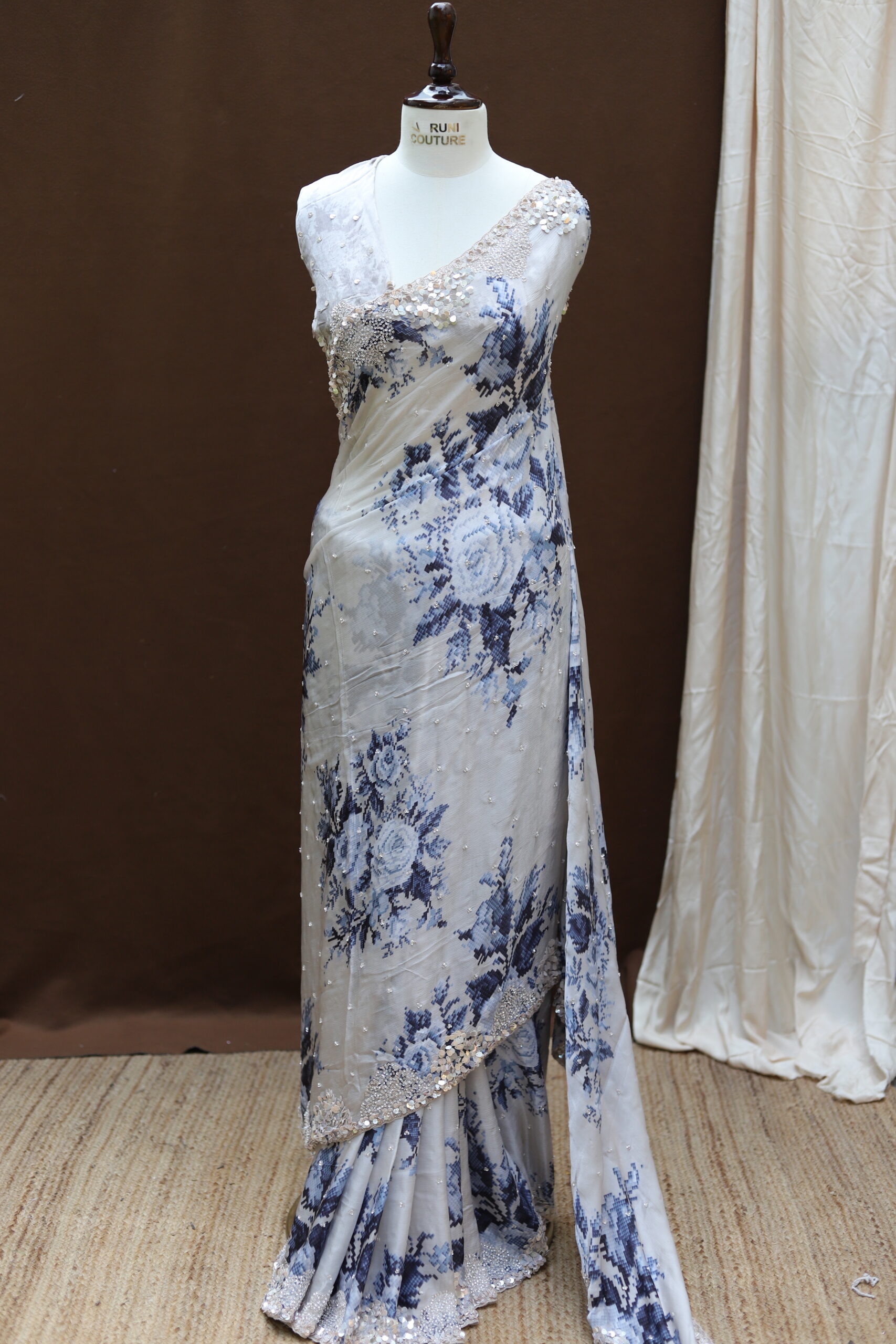 Pure crepe georgette saree adorned with elegant printed rose bunches all over. The saree is beautifully highlighted with a mix of small and big sequin work, finished with a delicate scalloped border on all four sides. Perfect as a cocktail saree, it comes with a matching blouse piece featuring intricate work on the back and sleeves for a graceful, festive look.