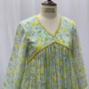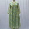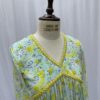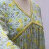 This dress features a soft pastel base with a combination of light yellow and blue floral prints, giving it a breezy and elegant look. The fabric is flowy and pleated, with a delicate V-neckline adorned with intricate mirror work and yellow lace detailing. The sleeves are 3/4th and slightly flared, adding to the graceful silhouette. The dress is paired with matching printed pants, creating a coordinated and stylish ensemble perfect for a casual or semi-formal occasion