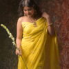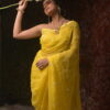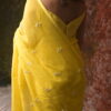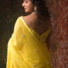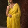 The saree in the image is a soft yellow-colored drape with a delicate and elegant look. It features small floral embroidery motifs spaced evenly across the fabric, enhancing its graceful appearance. The embroidery appears to be done with light-colored threads and subtle embellishments,The fabric looks like organza and. lending a lightweight and flowythis saree embodies a blend of modern pastel charm and classic Indian elegance.