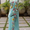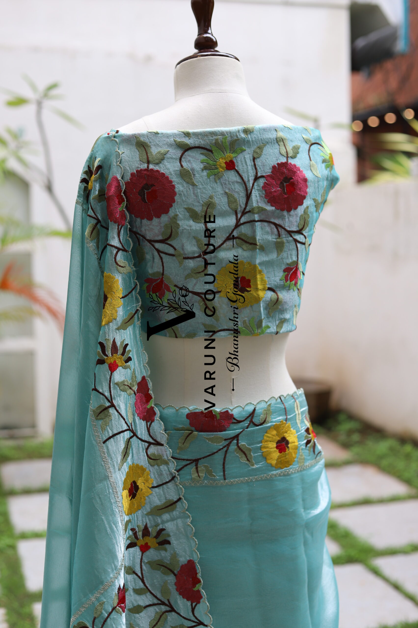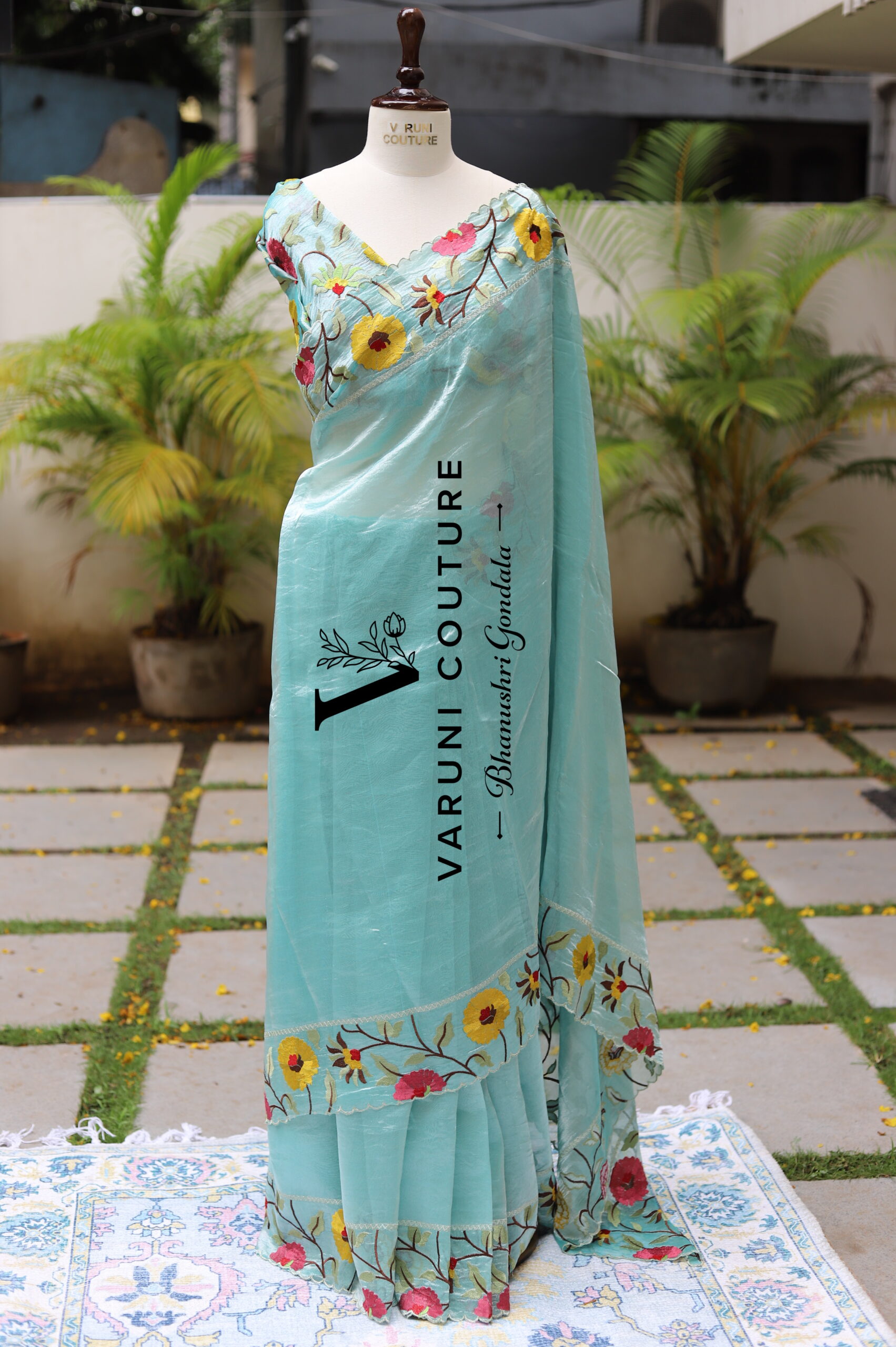 This exquisite pure tissue saree is a masterpiece of timeless elegance. Adorned with delicate thread embroidery, it features majestic floral motifs beautifully spread across all four sides of the border and the pallu, giving it a rich and regal appeal. The highlight of the ensemble is the fully embroidered blouse, intricately crafted with fine detailing to complement the saree’s grandeur. Light, lustrous, and graceful, this saree is perfect for weddings, festive occasions, and special celebrations, radiating sophistication with every drape.