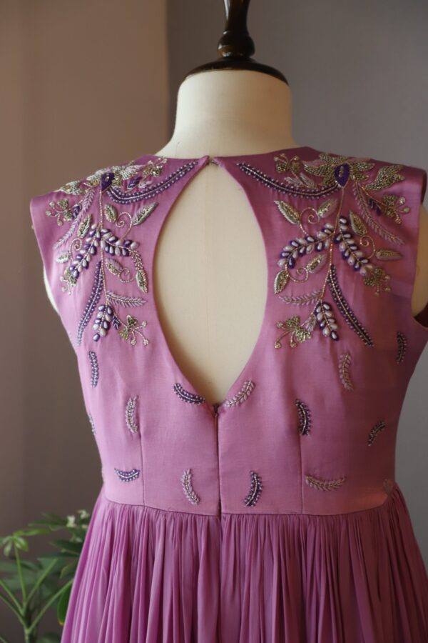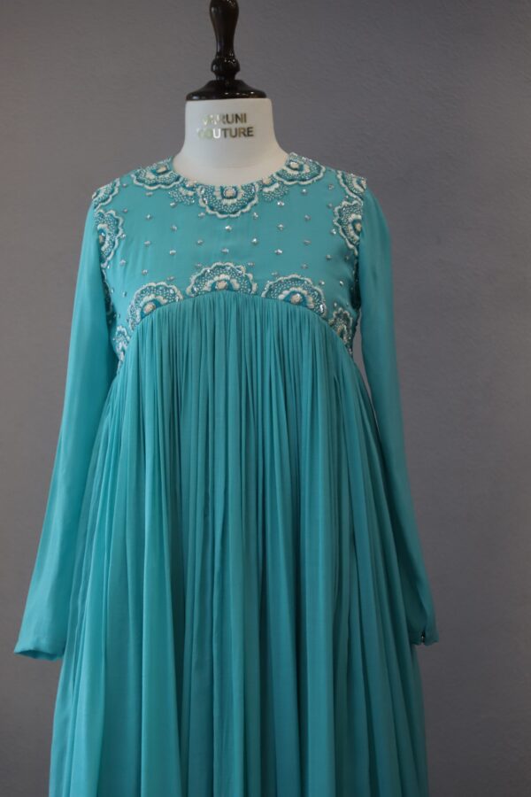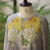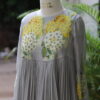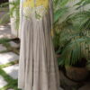 This graceful Dress is crafted in a soft, muted grey. The bodice and sleeves are adorned with intricate floral embroidery in shades of yellow, green, and white, adding a fresh and lively contrast to the subtle base. Perfect for a refined and graceful look, this dress blends minimalism with intricate craftsmanship effortlessly.