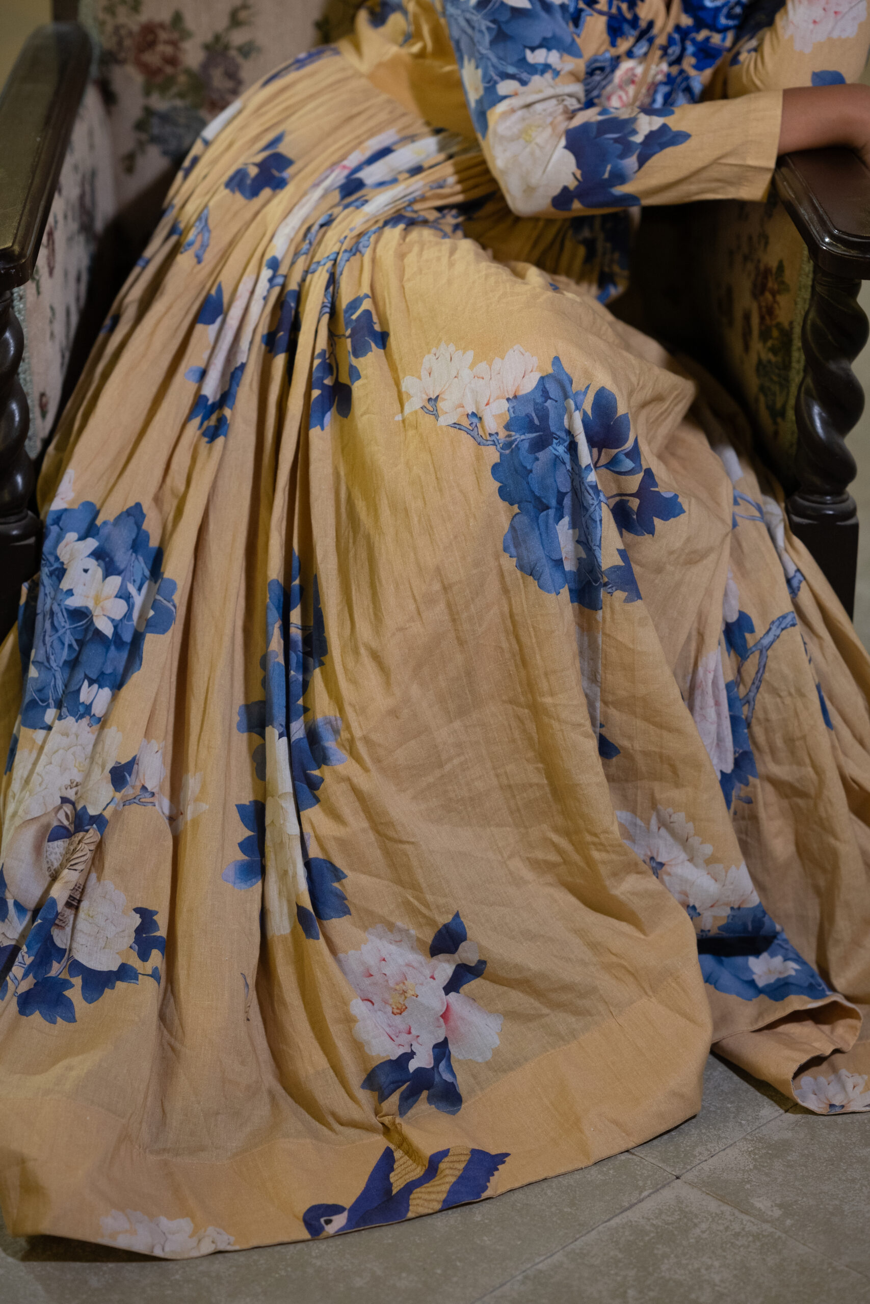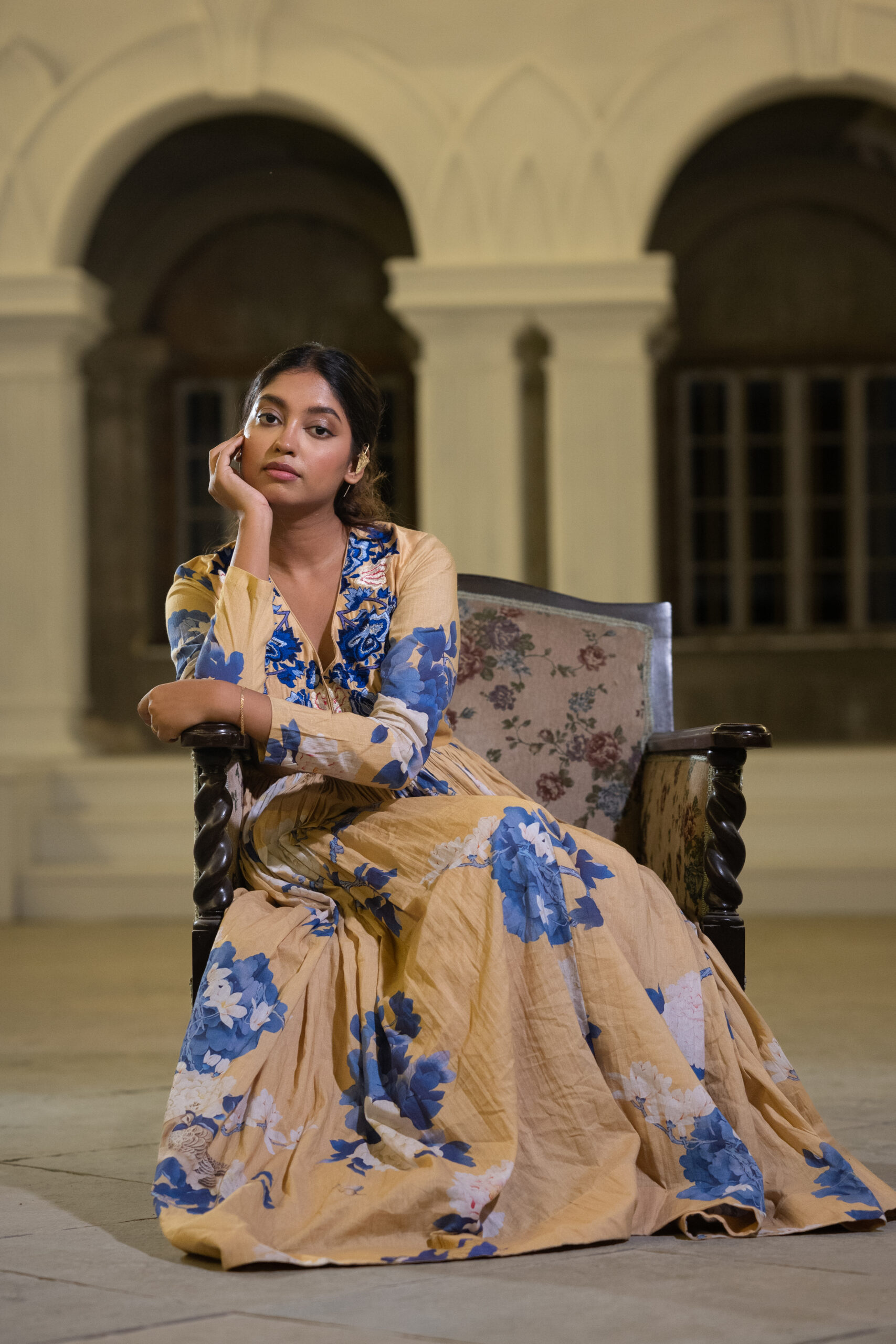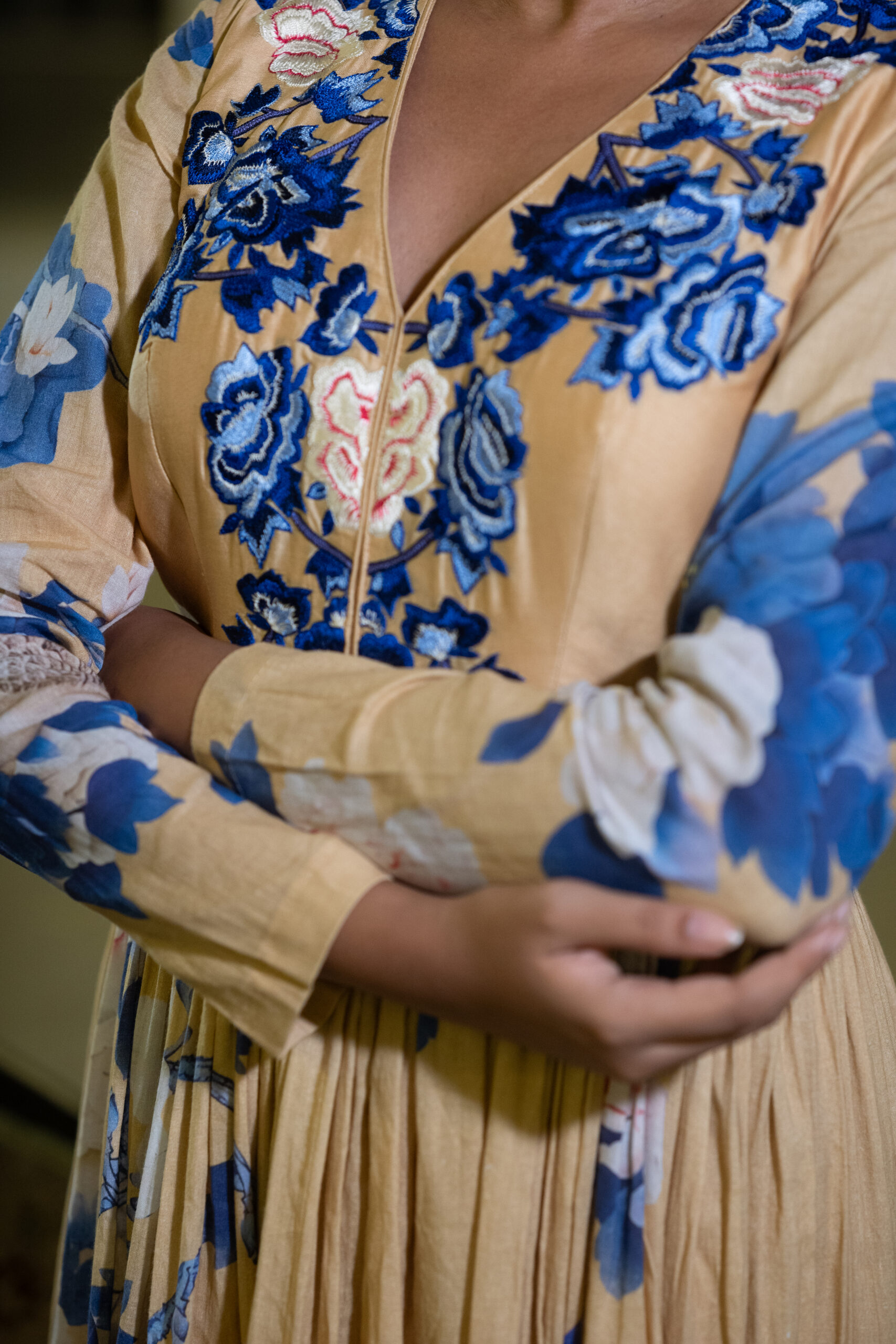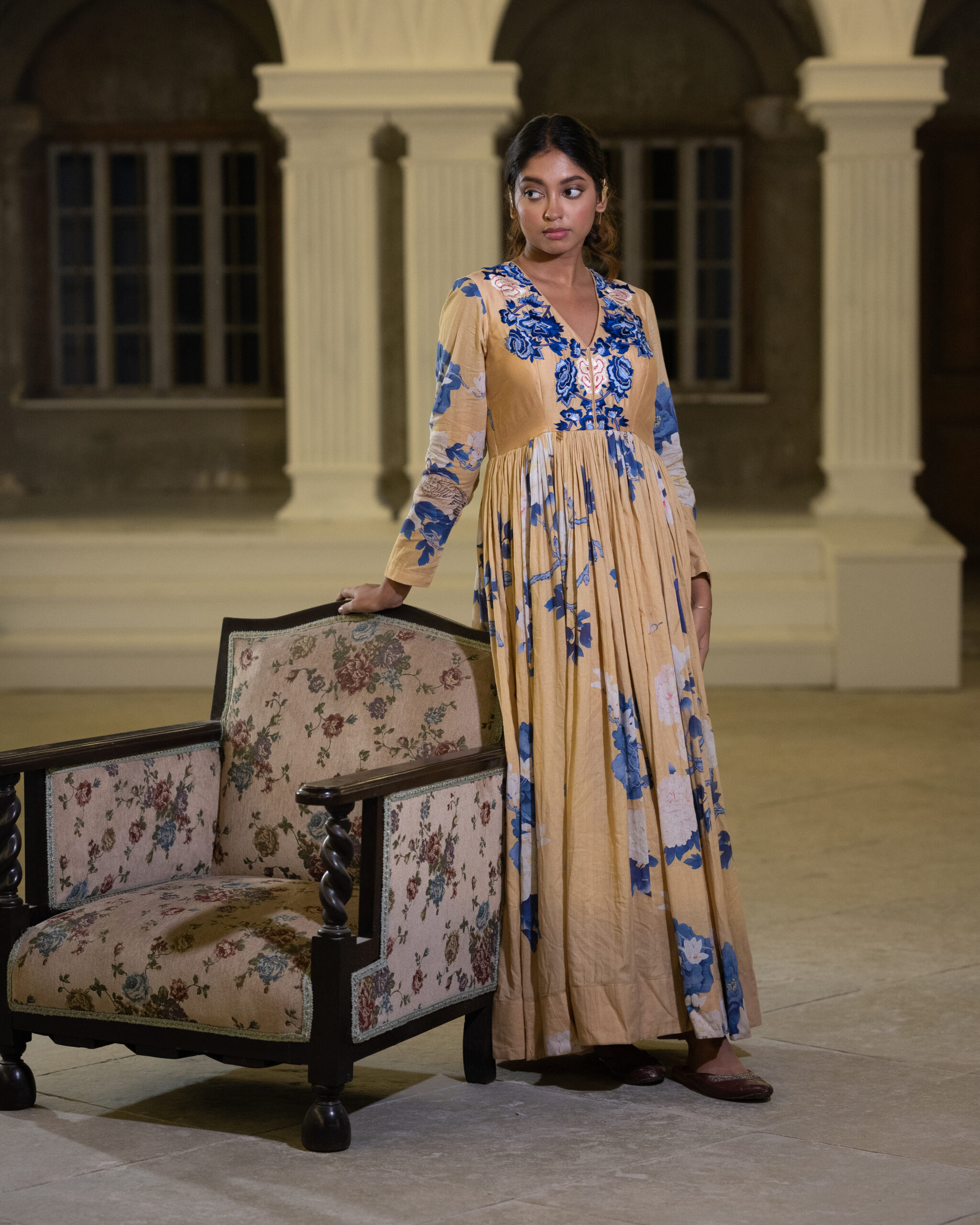 This stunning long dress is crafted from pure muslin fabric, featuring soft and graceful floral prints that add a refreshing charm. The beautifully designed yoke is highlighted with intricate thread embroidery, enhancing its elegance and giving it a refined, handcrafted touch. The flowy silhouette drapes effortlessly, making it a perfect choice for fancy date nights, evening outings, or any occasion where you want to look effortlessly stylish and graceful.