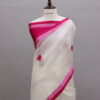 A graceful organza saree crafted in two soft shades of the same colour, offering a subtle and elegant gradient effect. The saree is beautifully finished with a rich satin border, adding a refined sheen to the drape. Delicate thread-work floral motifs paired with gota patti leaf highlights enhance its charm with a touch of tradition. The saree comes with a matching satin blouse piece, completing the look with sophistication and style.
