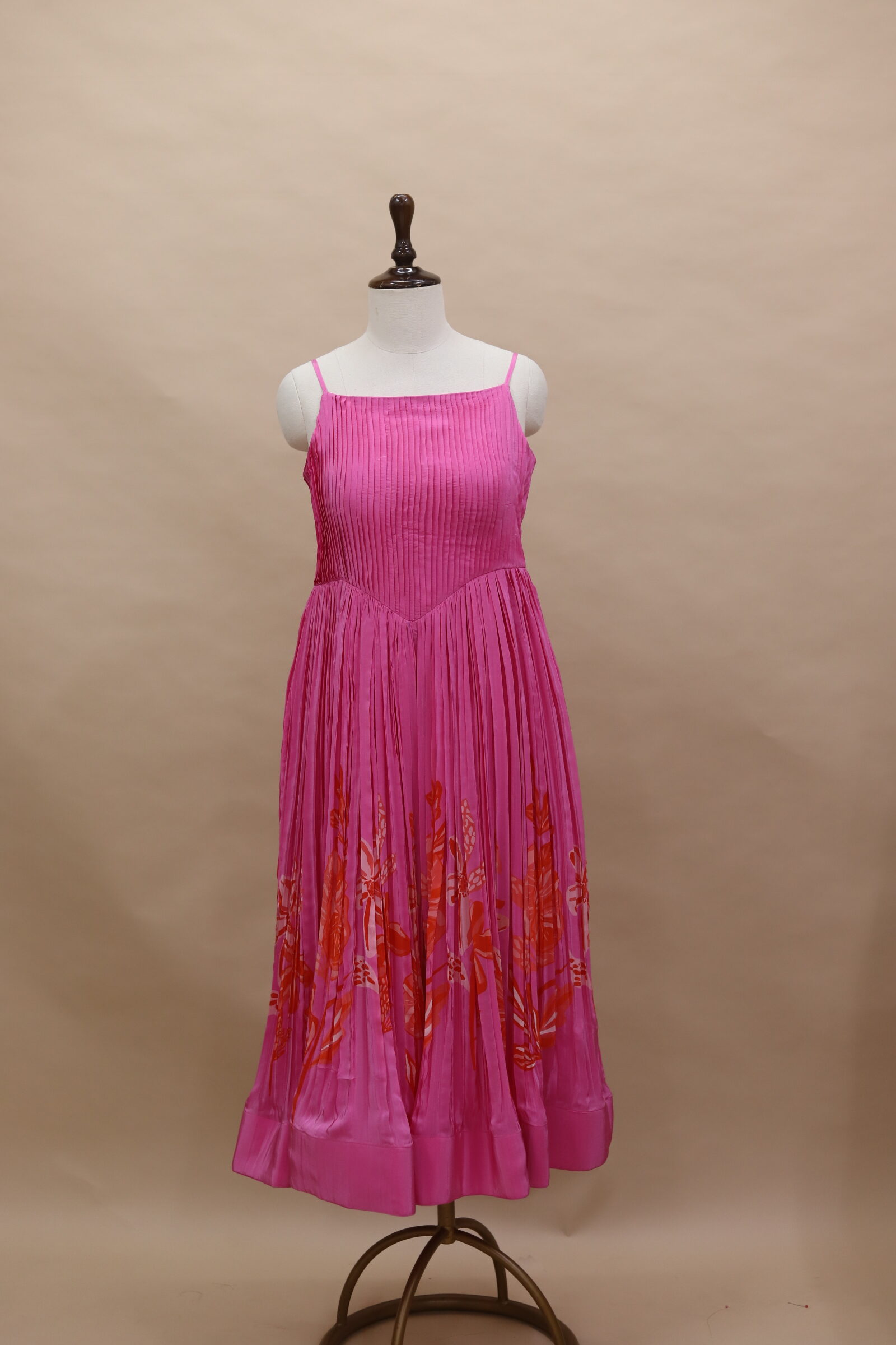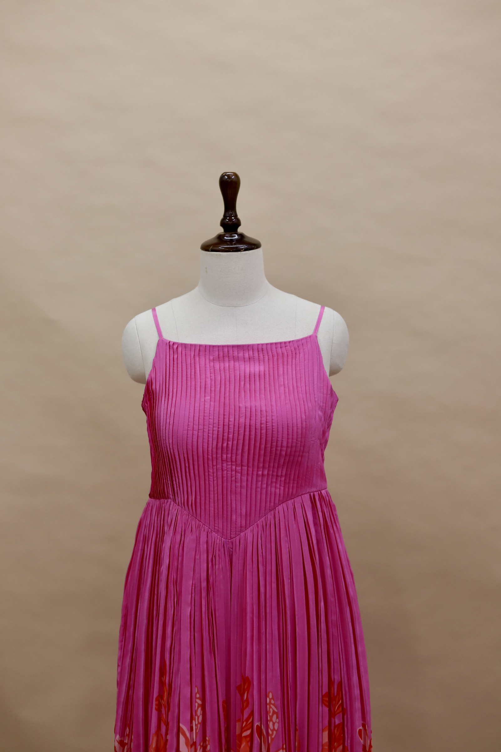 This elegant one-piece dress is made from breathable natural crepe floral printed fabric. The bodice features fine pintuck detailing on the yoke, complemented by delicate noodle straps and a beautifully flared fall for an effortlessly chic look. 1 piece