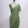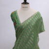 A graceful pure Chiniya silk saree crafted with delicate tissue strip weaving, giving it a soft sheen and fluid drape. The saree is beautifully finished with handworked sequin scallop edging on all four sides, adding a subtle festive sparkle. Paired with a rich raw silk blouse adorned with intricate floral thread-work embroidery, this ensemble blends contemporary charm with traditional elegance—perfect for occasions that call for understated luxury.