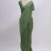A graceful pure Chiniya silk saree crafted with delicate tissue strip weaving, giving it a soft sheen and fluid drape. The saree is beautifully finished with handworked sequin scallop edging on all four sides, adding a subtle festive sparkle. Paired with a rich raw silk blouse adorned with intricate floral thread-work embroidery, this ensemble blends contemporary charm with traditional elegance—perfect for occasions that call for understated luxury.
