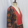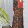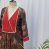 This floral wrap dress features a blue base with vibrant red, orange, and green floral prints, complemented by a deep red pleated panel with gold detailing. Paired with a matching blue base floral pant, it offers a perfect blend of elegance and modern style.