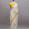 A graceful organza saree crafted in two soft shades of the same colour, offering a subtle and elegant gradient effect. The saree is beautifully finished with a rich satin border, adding a refined sheen to the drape. Delicate thread-work floral motifs paired with gota patti leaf highlights enhance its charm with a touch of tradition. The saree comes with a matching satin blouse piece, completing the look with sophistication and style.