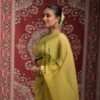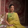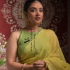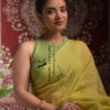 The saree in the image is a refreshing and elegant shade of lime green with a soft, sheer texture, likely crafted from organza . It features subtle sequin and thread hand embroidery motifs scattered across the drape, adding a touch of sparkle without overpowering the look. The saree is paired with a contrasting green blouse that showcases intricate embroidery and a sleeveless, high-neck design, creating a modern