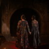Dark base fabric with floral and metallic motifs.