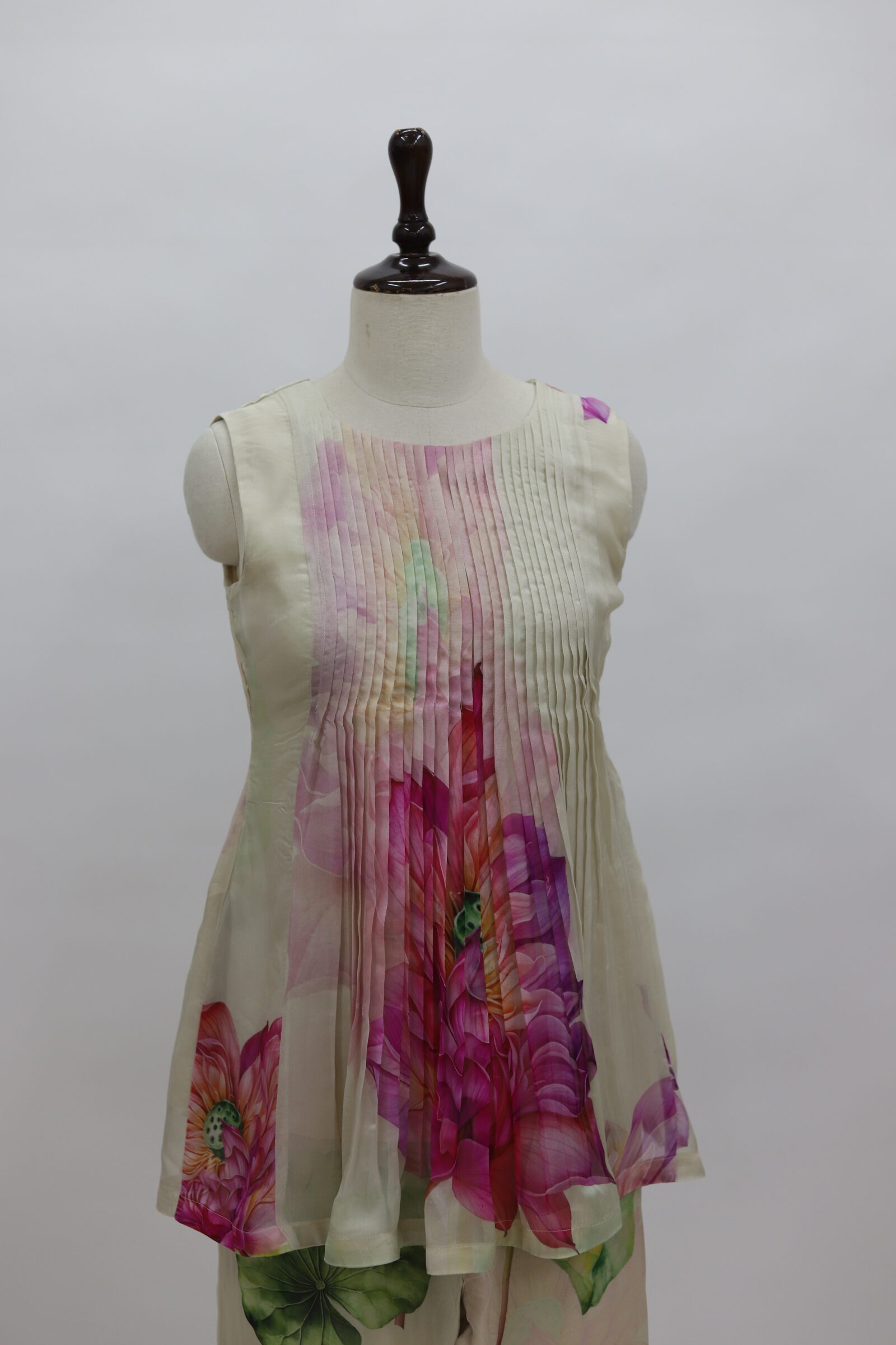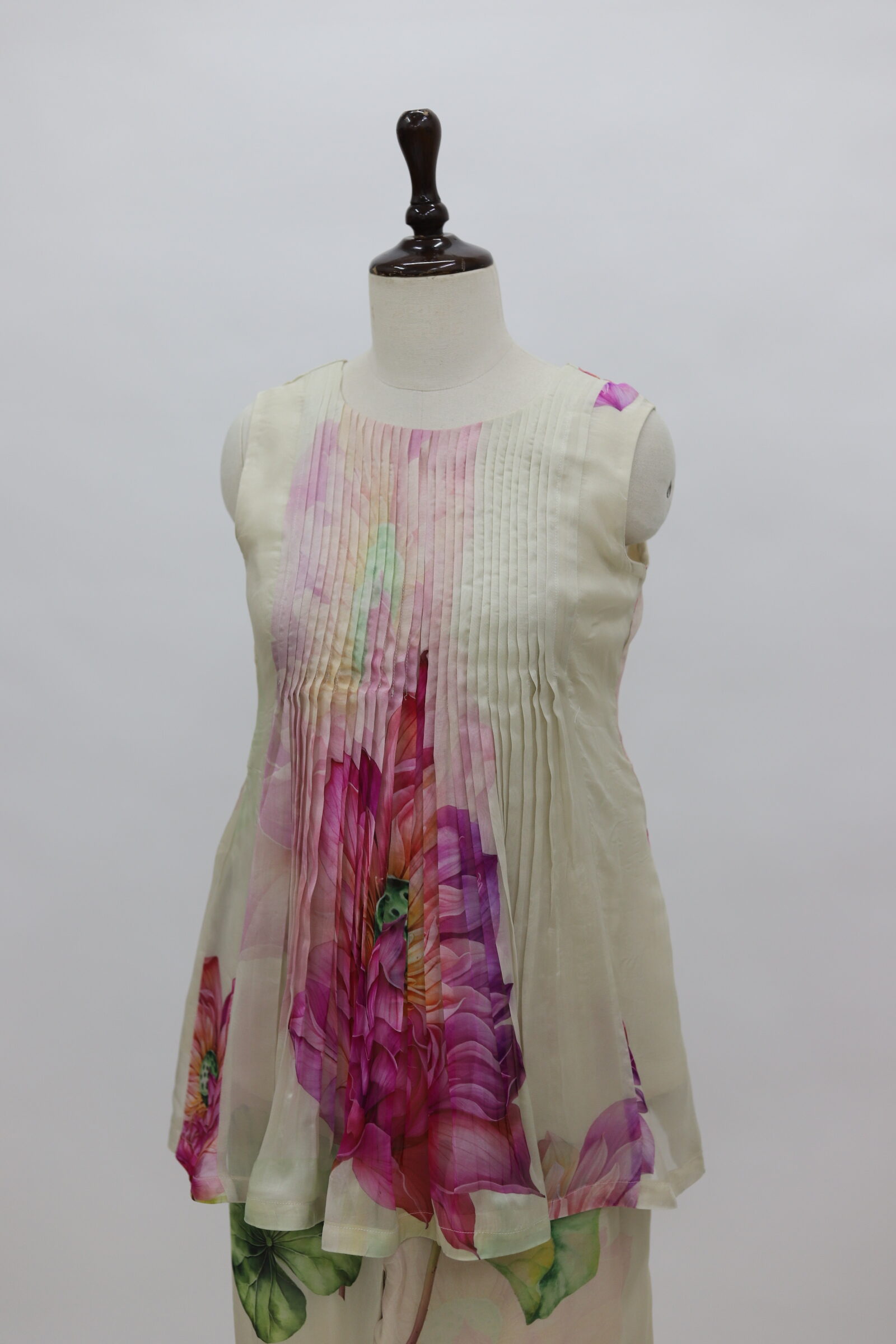 An ethereal co-ord set crafted in lightweight organza, adorned with soft floral prints that lend a fresh, graceful charm. The sleeveless top features delicate pintuck (pintex) detailing along the front, adding refined texture and structure to the silhouette. Paired with coordinated straight-fit pants highlighted with subtle floral placements, this ensemble feels airy, elegant, and effortlessly chic—perfect for daytime celebrations, brunches, or refined festive wear.