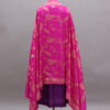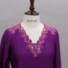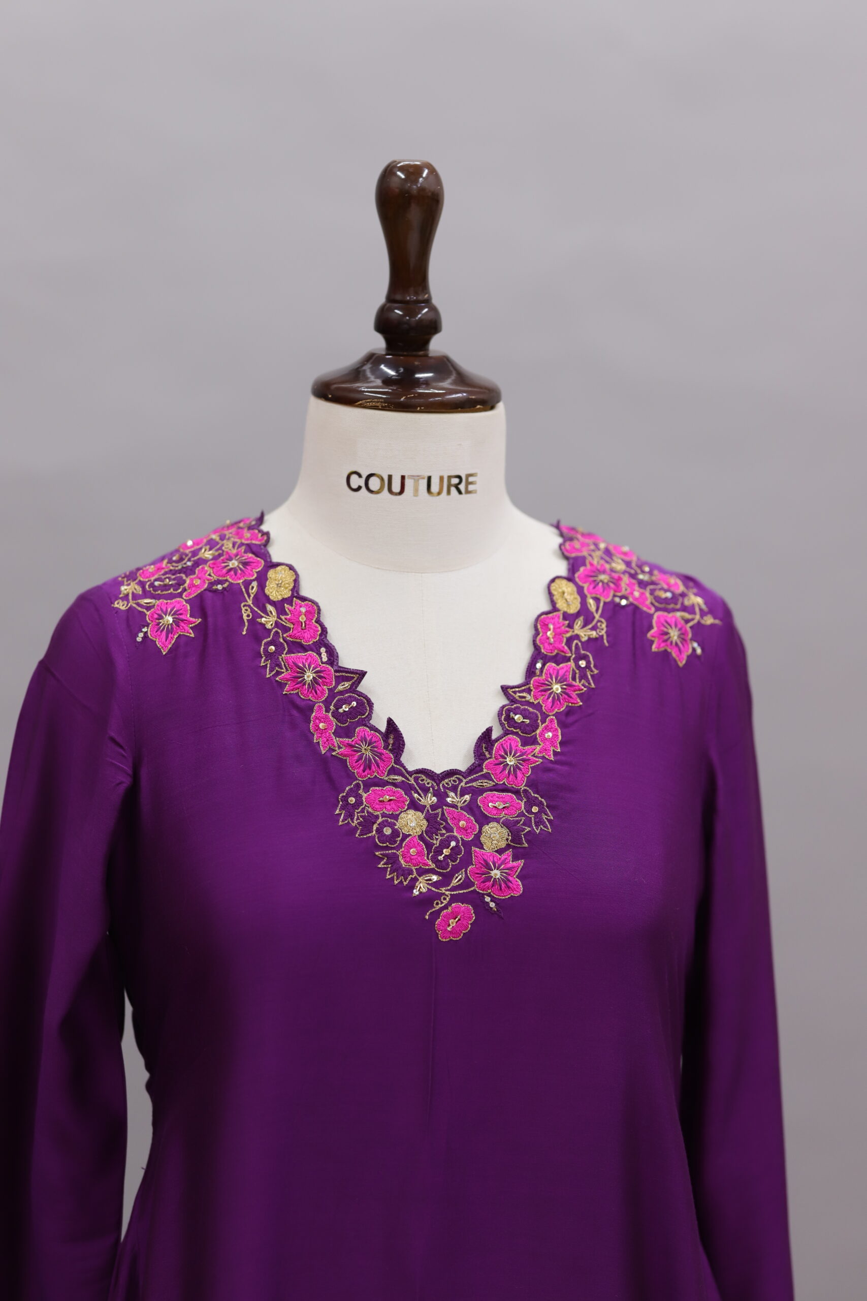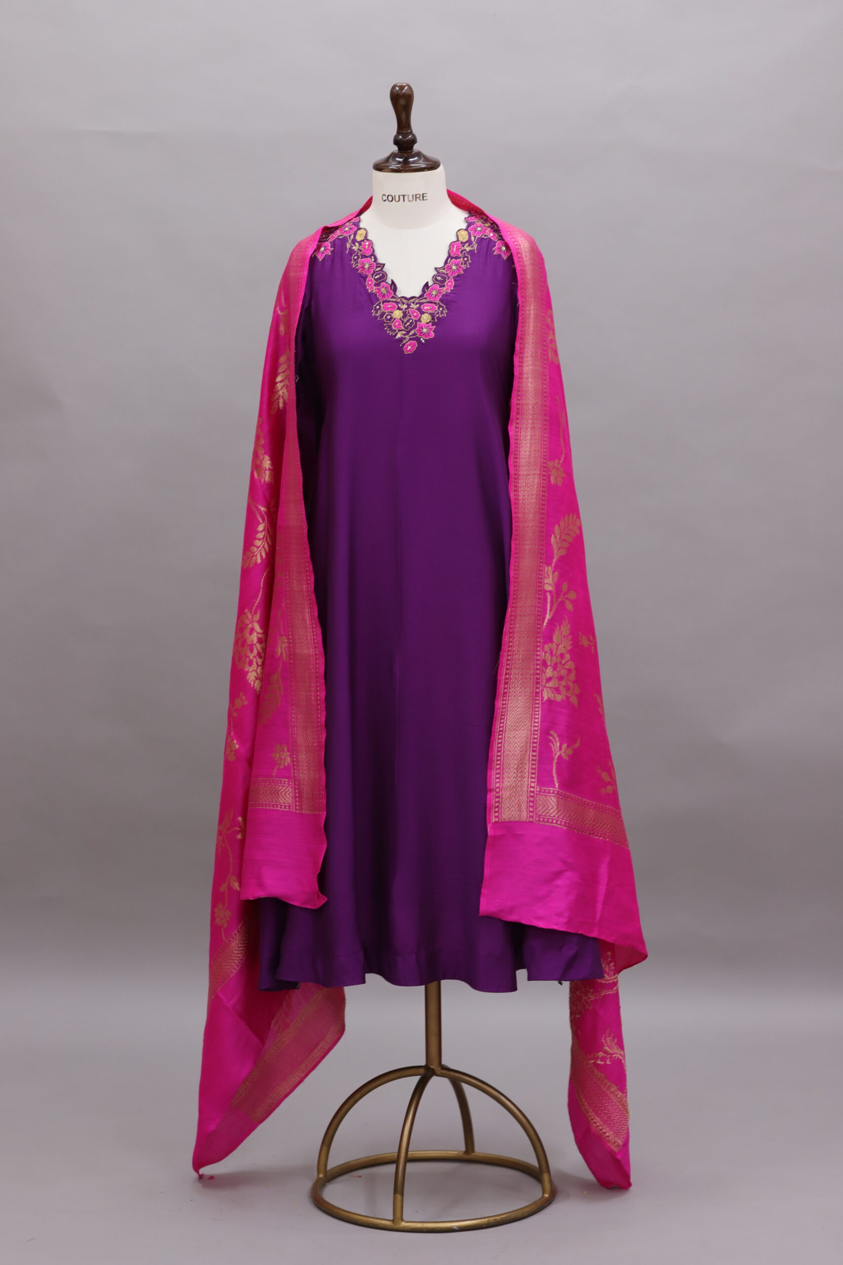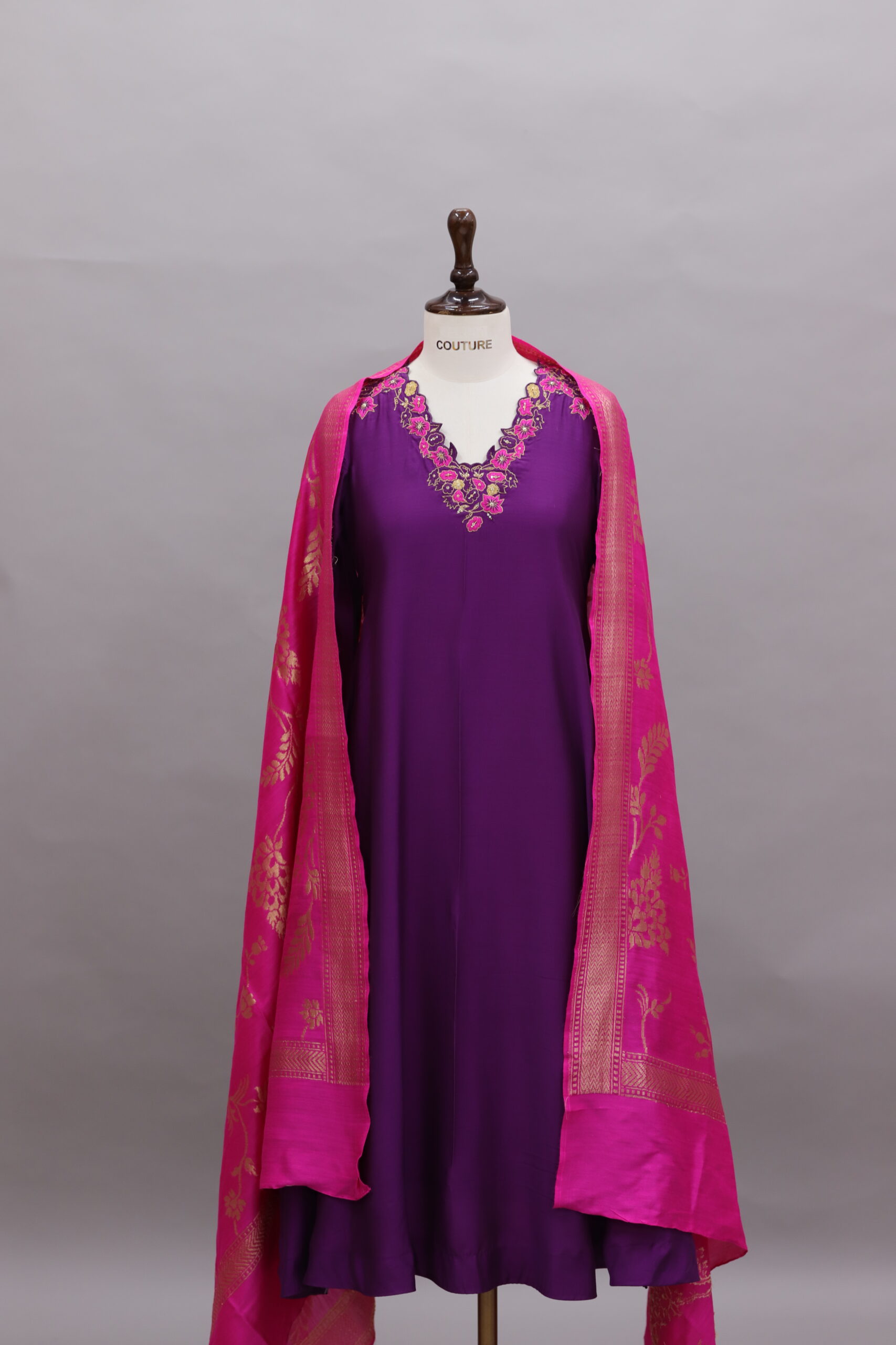 Pure satin A-line kurti beautifully adorned with intricate hand embroidery on the neckline, paired with a rich munga silk dupatta highlighted by allover gold zari floral weaving. A timeless blend of grace and luxury.