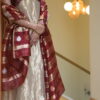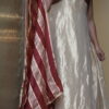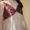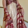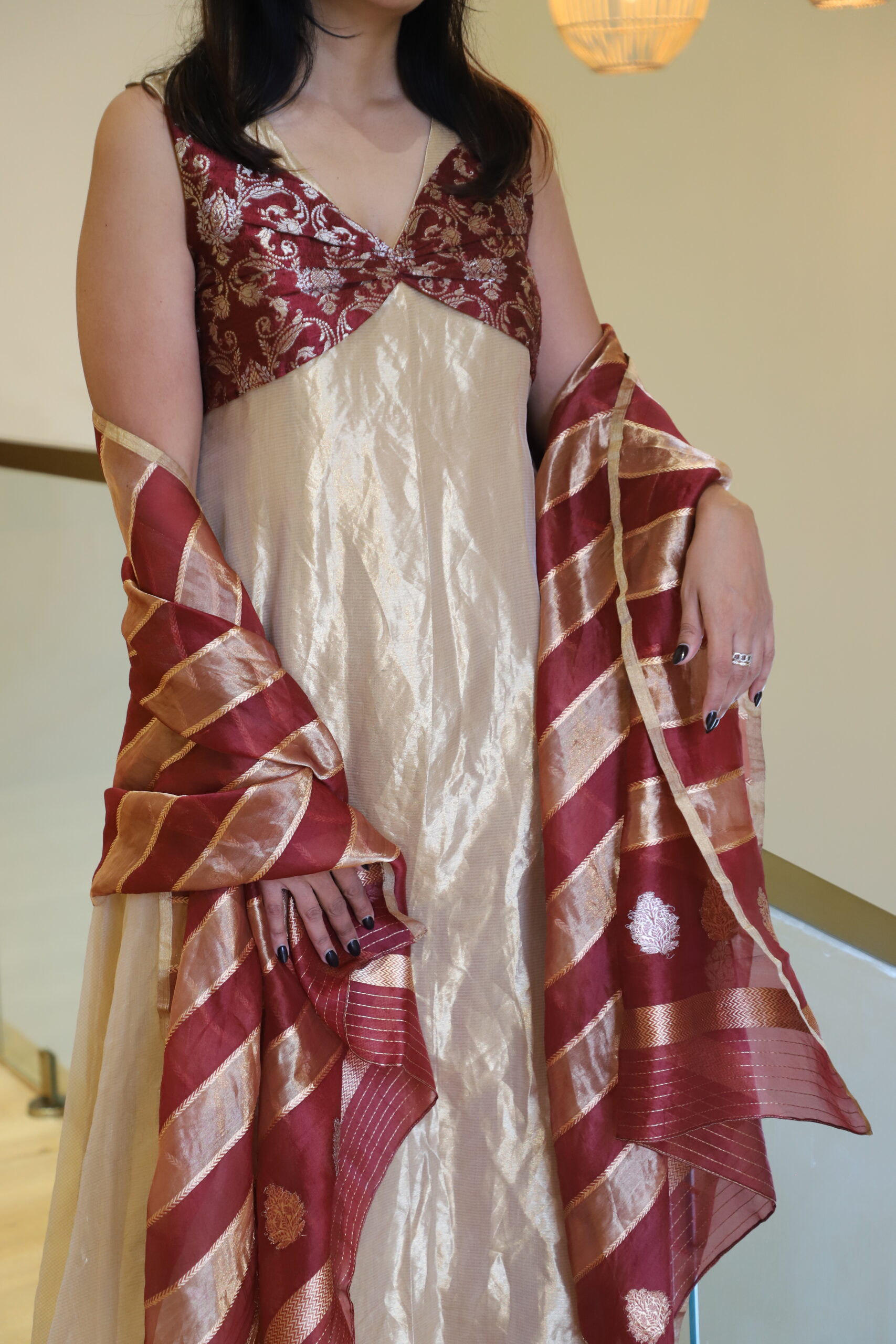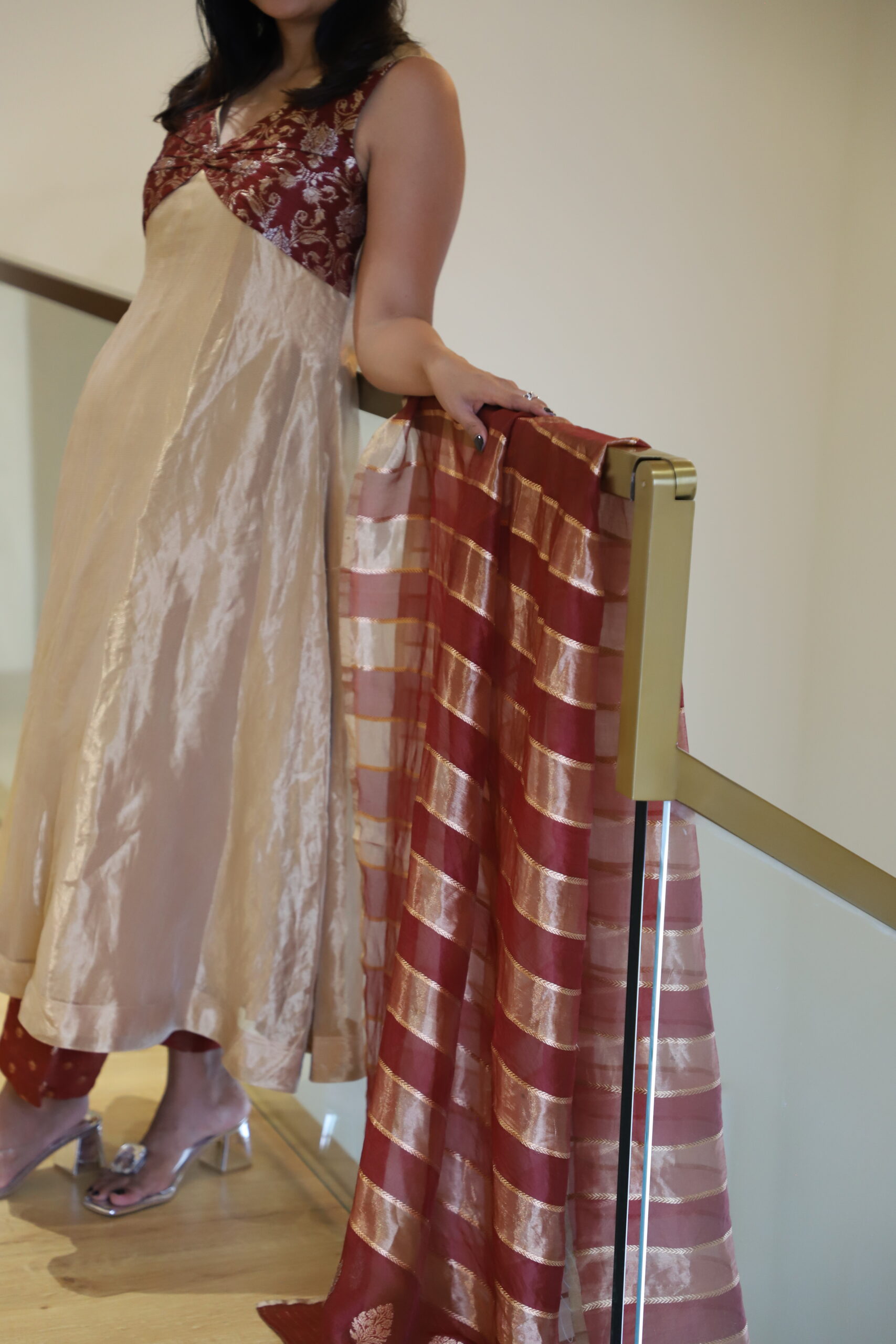 Graceful A-line top crafted in pure tissue fabric, paired with contrast brocade yoke and pants that add a rich traditional touch. The ensemble is complemented by a zari organza dupatta, lending a subtle shimmer and festive charm. Perfect for poojas, festive gatherings, and evening parties, this outfit beautifully blends tradition with modern sophistication.
