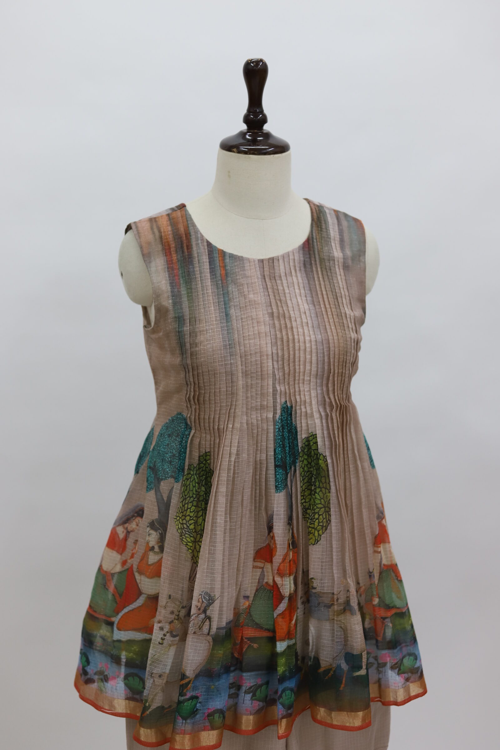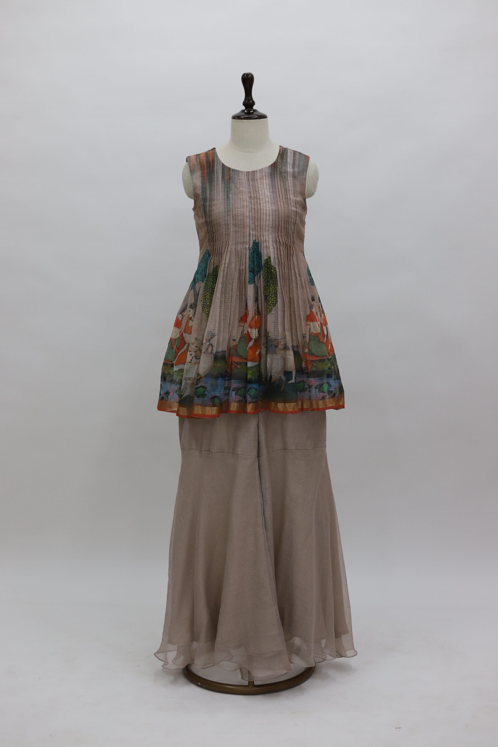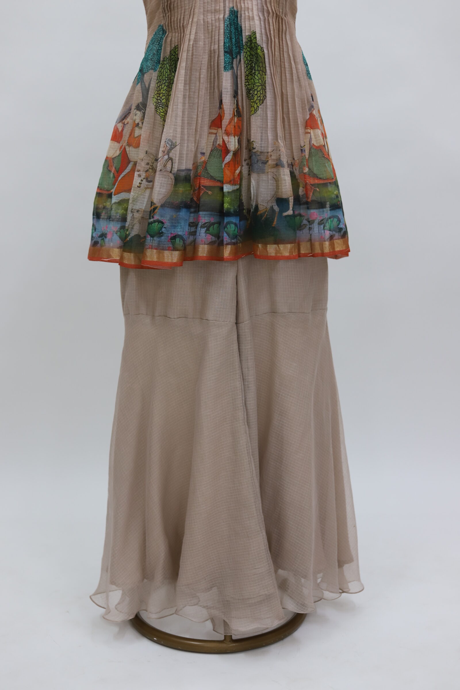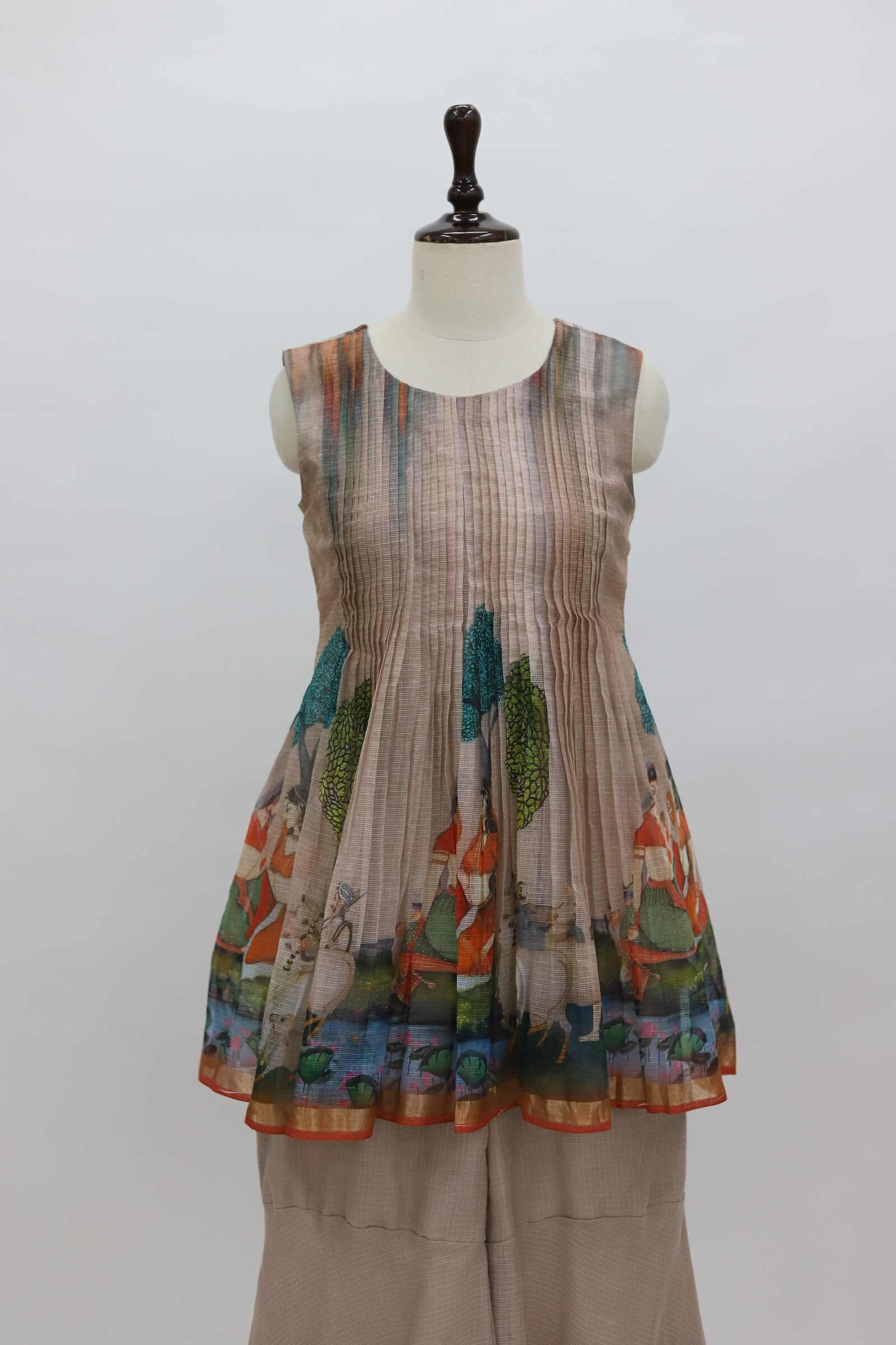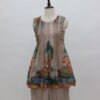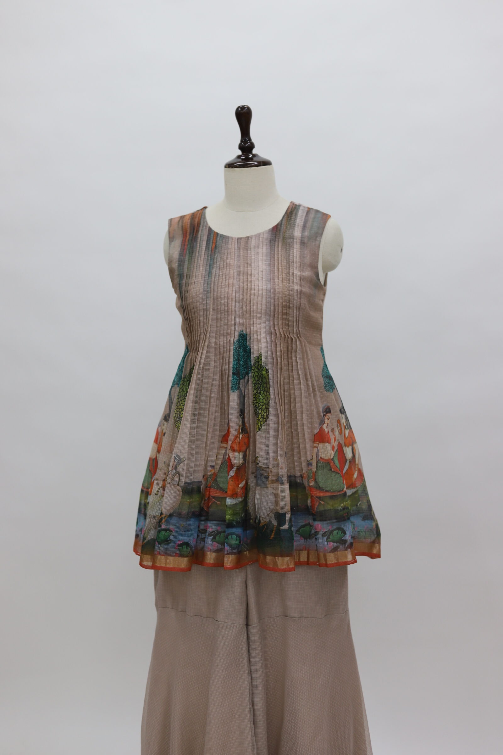 A charming ensemble crafted in airy Kota fabric, styled into a cute sharara-pattern silhouette. The sleeveless top is beautifully detailed with fine pintuck (pintex) work on the yoke, adding soft texture and elegance. The hem is highlighted with artistic prints on Kota fabric, bringing a playful yet graceful touch. Paired with flowy sharara bottoms in a complementing tone, this outfit feels light, breezy, and effortlessly stylish—perfect for daytime festivities or elegant casual wear.