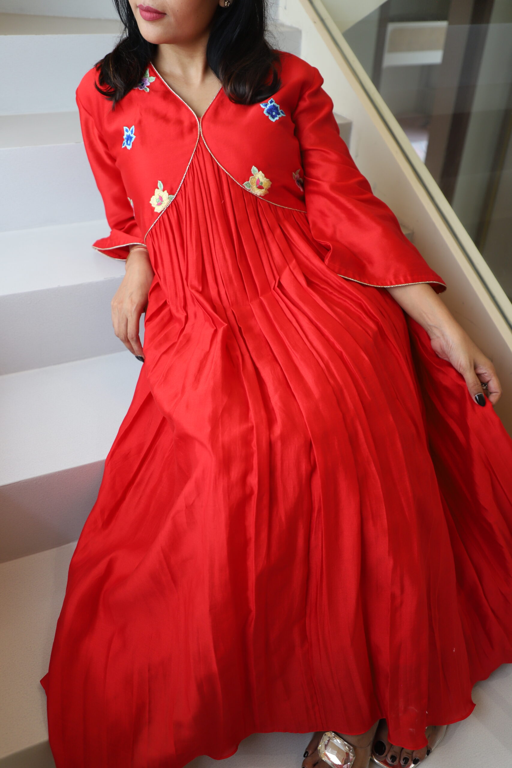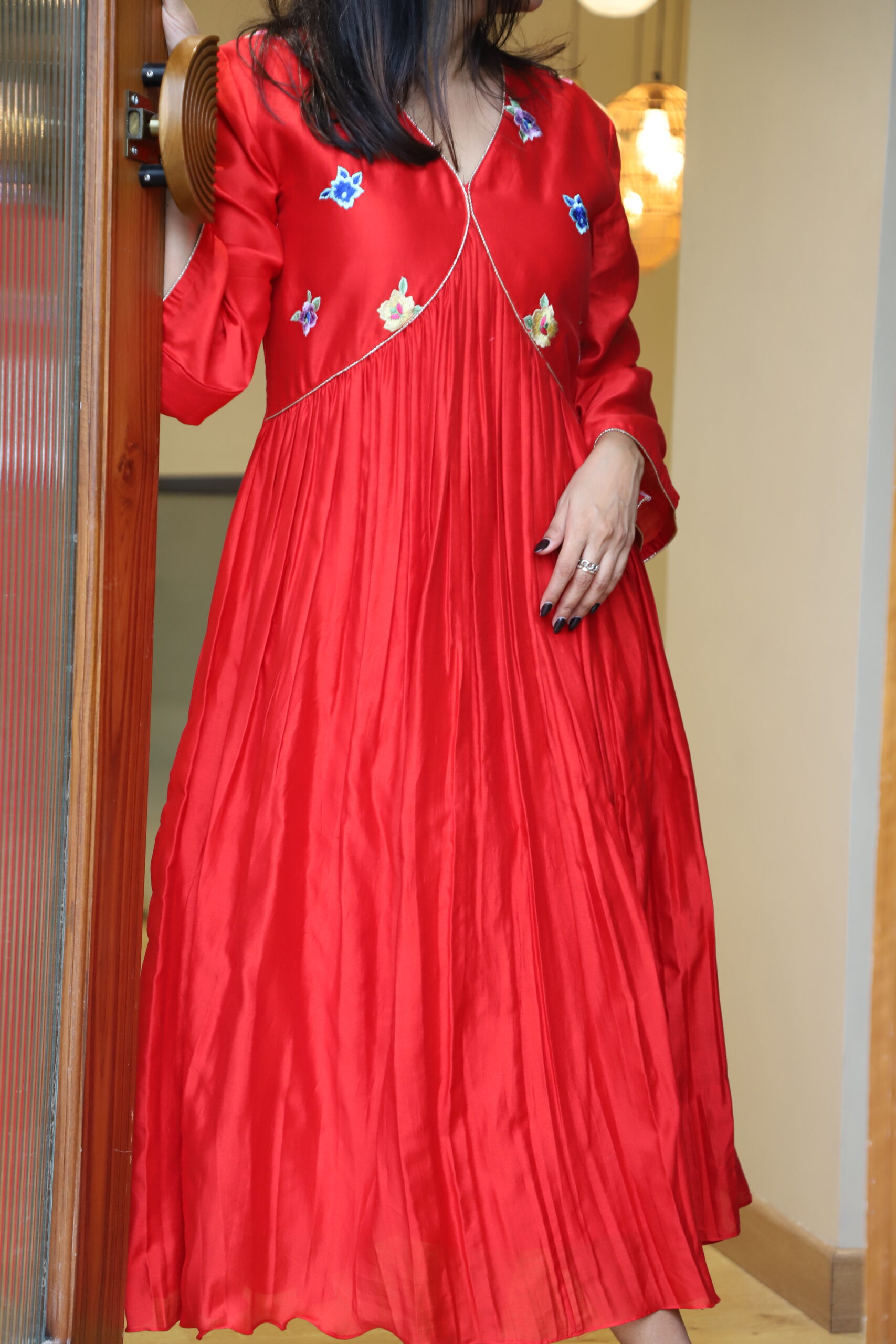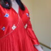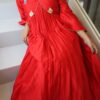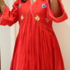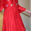 Pure Mul Chanderi fabric outfit featuring a beautifully hand-embroidered yoke adorned with colorful floral thread buttas. The neckline and sleeve edges are delicately finished with fine golden piping, adding a subtle touch of elegance and charm.