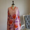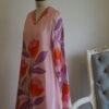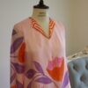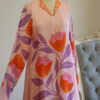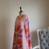 This is a stylish women’s cord set featuring a shiny satin-silk fabric in a soft blush pink base. The kurta (top) has full sleeves and is decorated with bold, vibrant floral prints in shades of orange and lavender, creating a striking contrast. The neckline has a unique striped inner detailing in orange and white, adding an extra touch of design. The floral motifs consist of elegant orange flowers paired with lavender leaves, giving it a fresh, artistic look perfect for both casual and semi-formal occasions. The flowy silhouette enhances its graceful, relaxed vibe