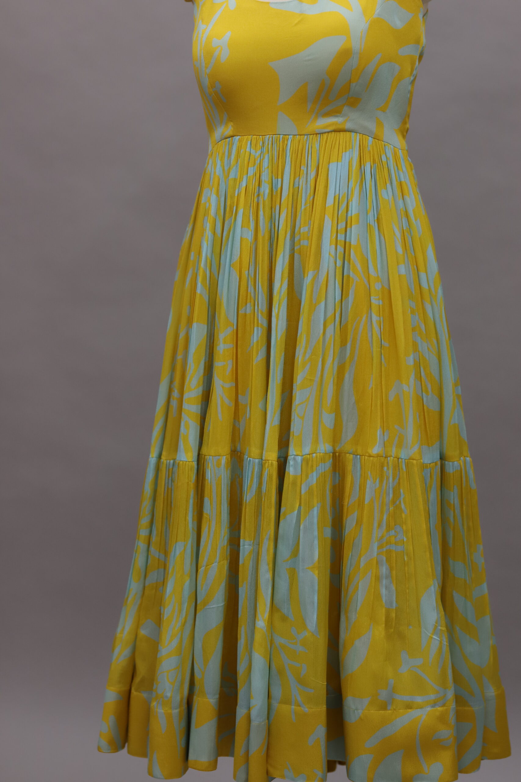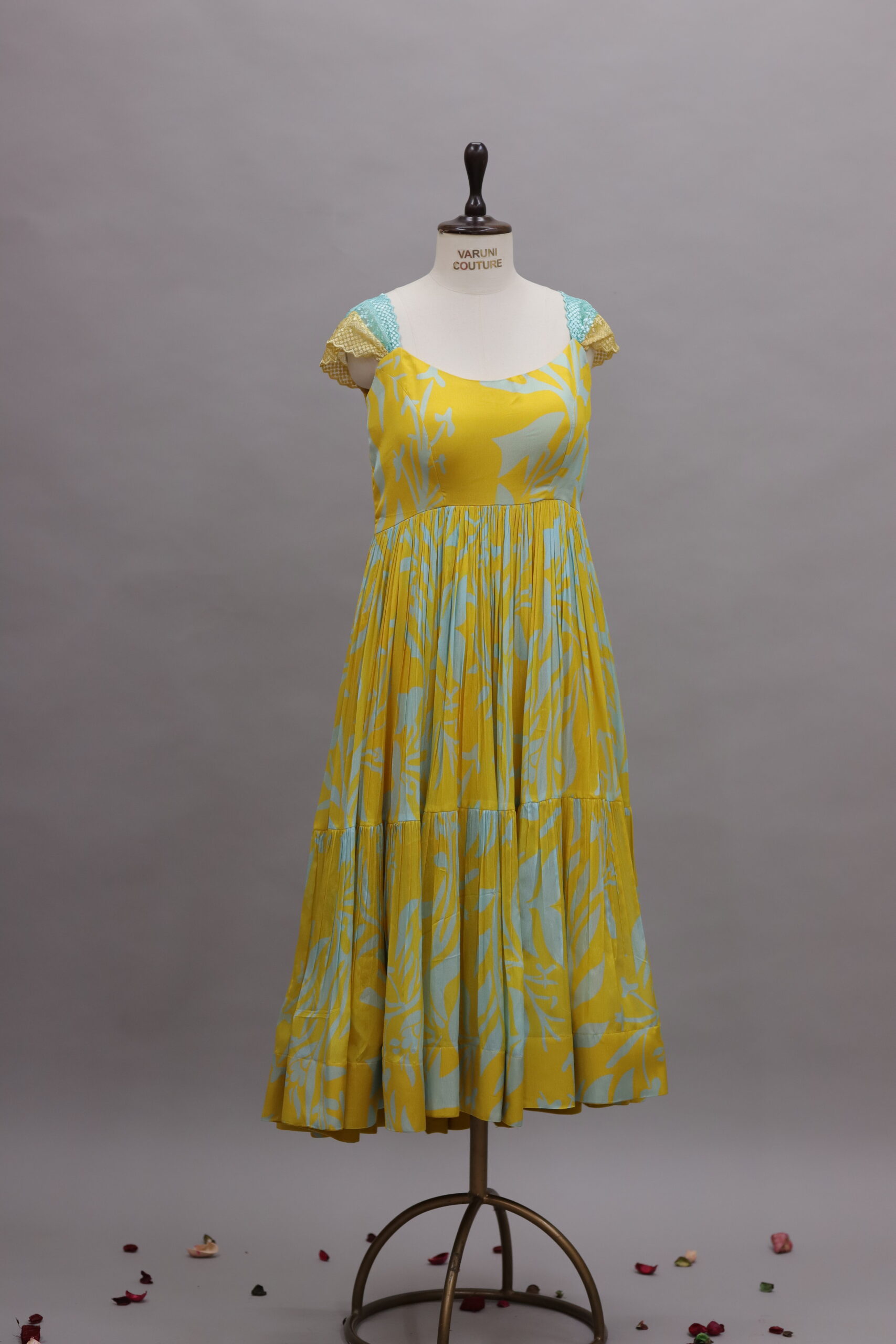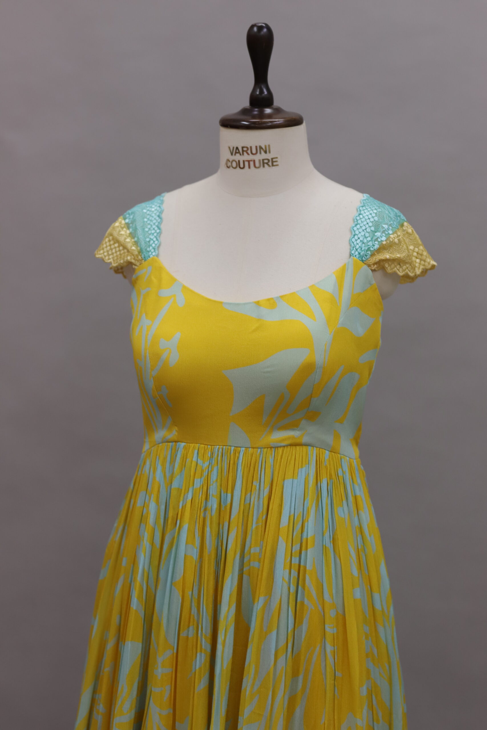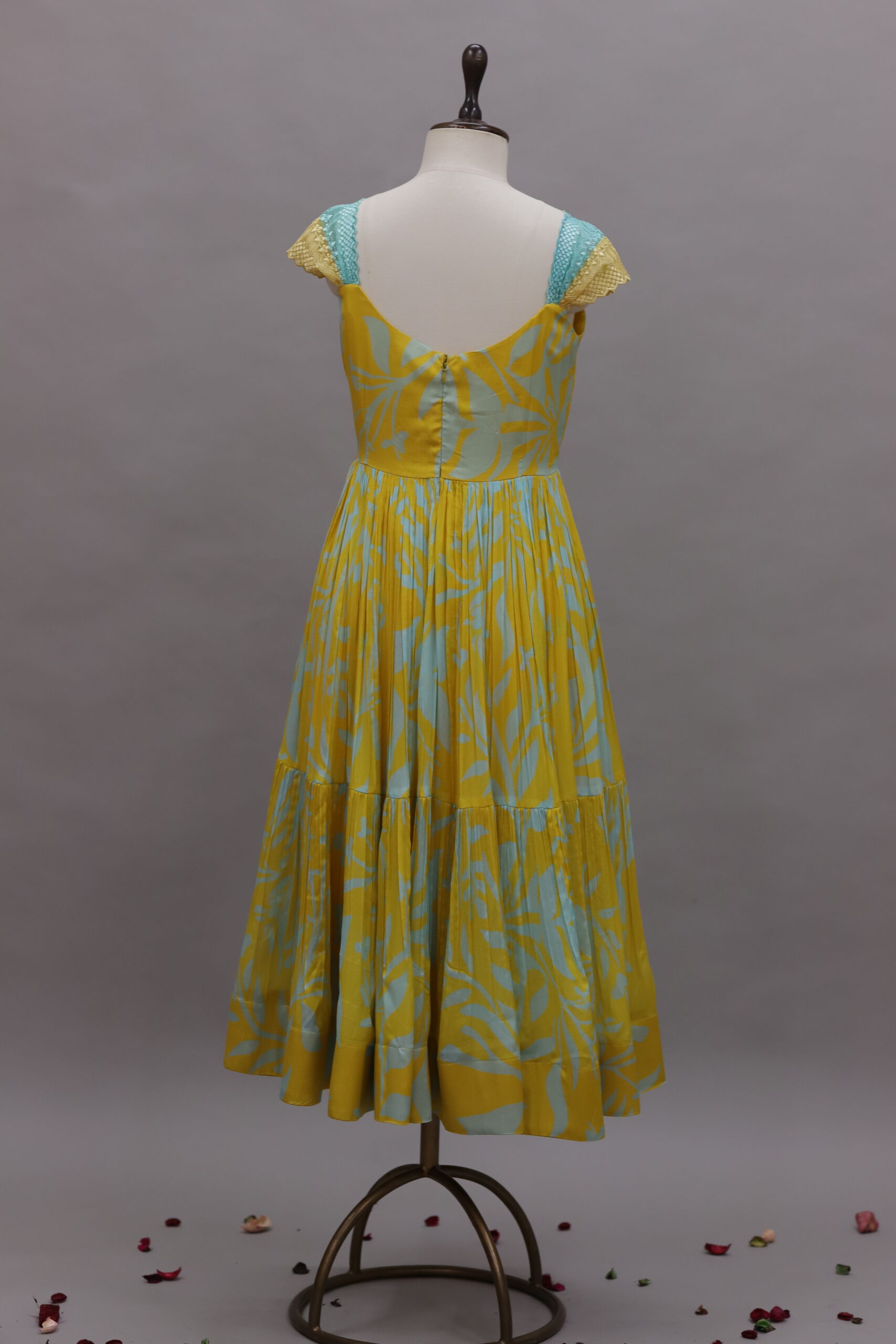 Pure chiffon printed fabric crafted into a breezy A-line tunic, featuring a soft two-tiered gathered flare for added volume and flow. The sleeves are beautifully styled with two-tiered ruffles and finished with a delicate crochet border, giving the piece a charming handcrafted touch. A perfect single-top tunic for casual outings, brunches, or daytime events.