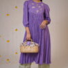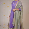 This elegant outfit features a lavender kurta with delicate gold embroidery and pleated detailing, adding a regal touch. The matching sage green pant complements the look, creating a harmonious blend of colors. A sheer olive-gold dupatta with metallic border.