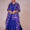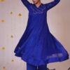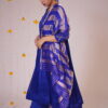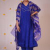 This royal blue ensemble features a pleated, flowy kurta with delicate golden embroidery accentuating the neckline, adding a regal touch. The matching pant complement the rich hue, creating a seamless and elegant look. The dupatta is adorned with golden zari stripes and motifs, enhancing its traditional appeal while adding a hint of shimmer.
