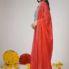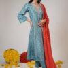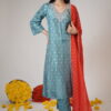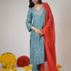 This elegant ensemble features a soothing teal-blue kurta adorned with delicate silver & Pink floral embroidery, adding a touch of grace and sophistication. The V-neckline is enhanced with intricate embellishments, creating a subtle yet striking effect. The set is paired with matching teal-blue pants, maintaining a harmonious and refined look. A vibrant red dupatta with gold polka dot detailing and a shimmering border beautifully contrast.