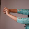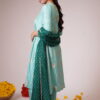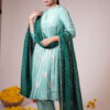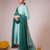 This elegant sea-green Anarkali kurta adorned with delicate golden and green colours motifs, adding at yock part and sleeve a regal charm to the attire. The fabric has a soft, luxurious sheen, with subtle pleats enhancing the flowy silhouette. The set is paired with matching straight-fit pants, maintaining a sophisticated and graceful appeal. Complementing the ensemble is a deep emerald green dupatta, intricately designed with golden polka dots and a fine embellished border.