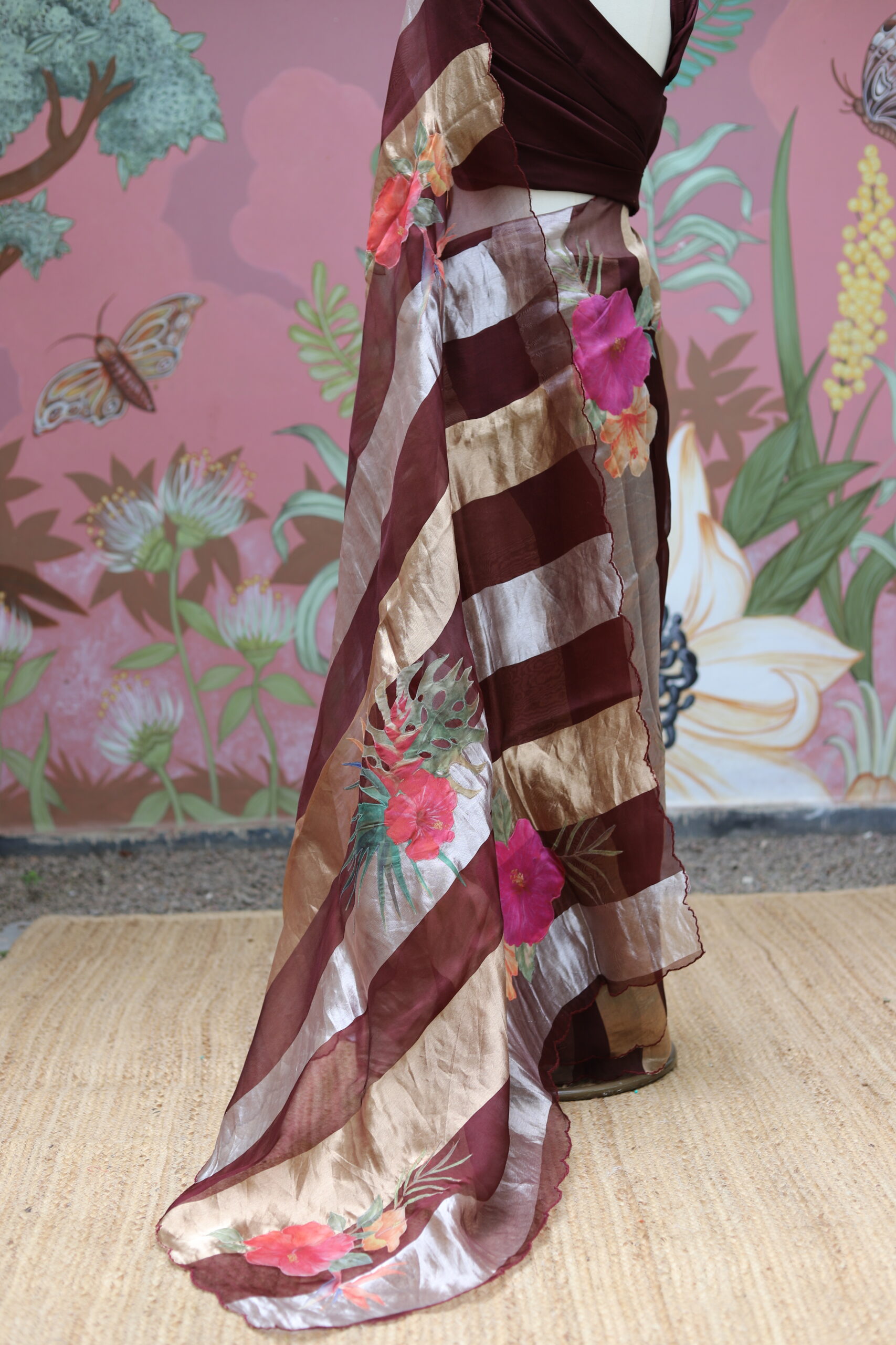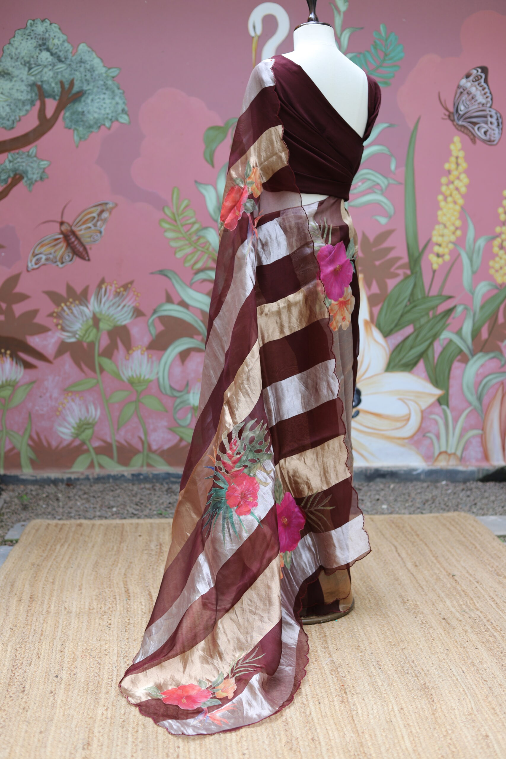 An exquisite tissue and organza mix saree adorned with elegant floral applique work that adds a touch of artistic charm. The saree is beautifully finished with scallop detailing on all four sides, enhancing its refined appeal. It is paired with a raw silk blouse piece, designed with two delicate floral buttis on the sleeves, completing the look with subtle sophistication. Perfect for festive occasions, poojas, and graceful evening events.