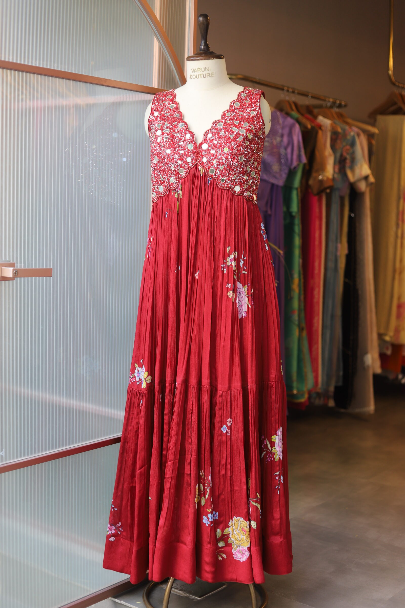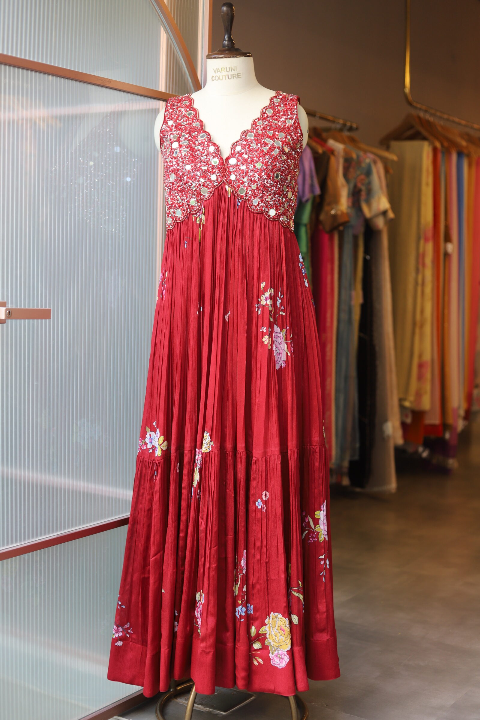 Pure Chinnon Chiffon floral printed fabric, tailored into a beautiful long gown featuring an elegant Aaliya cut silhouette.