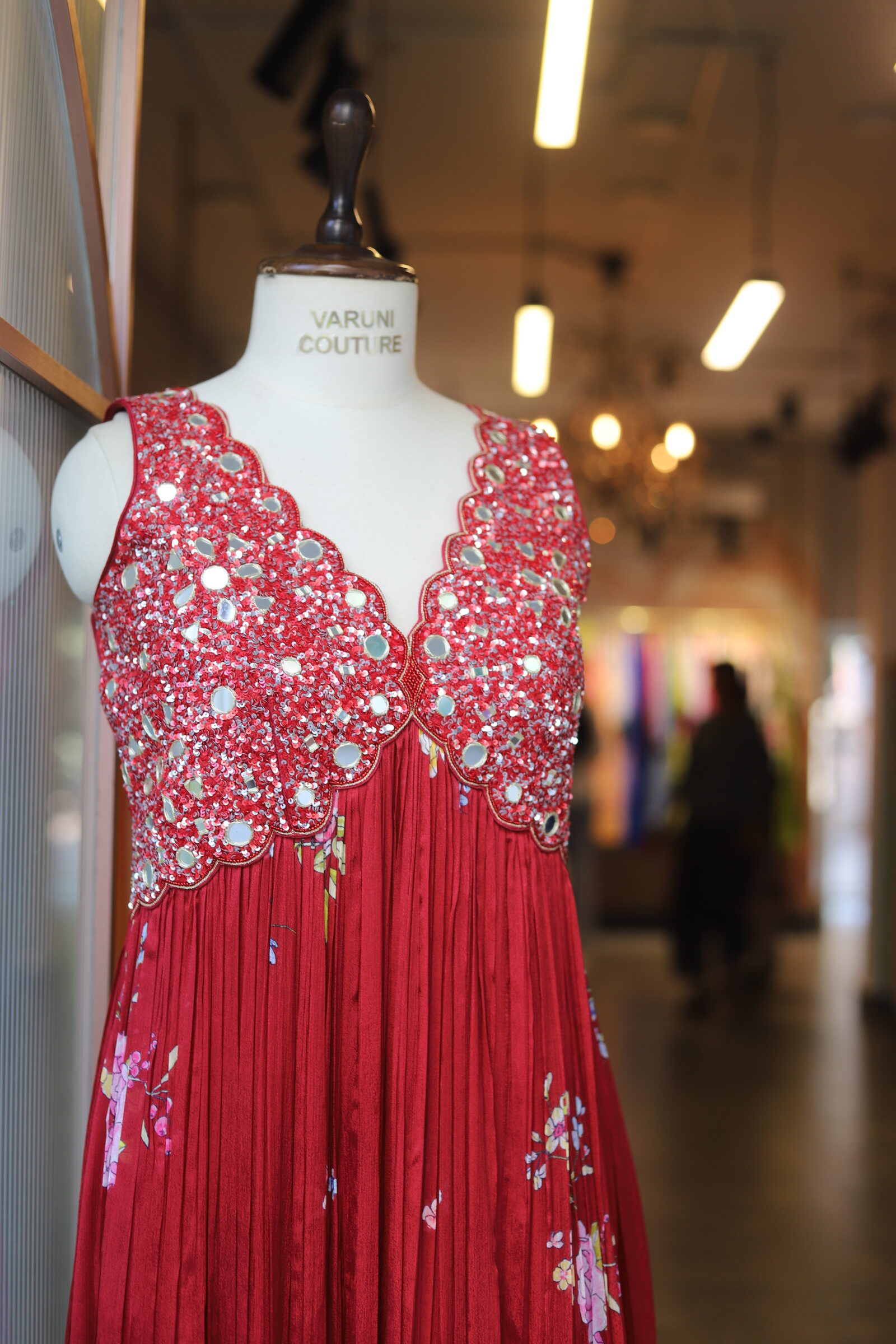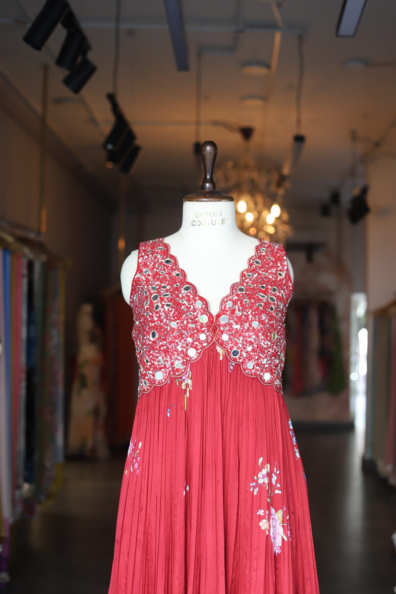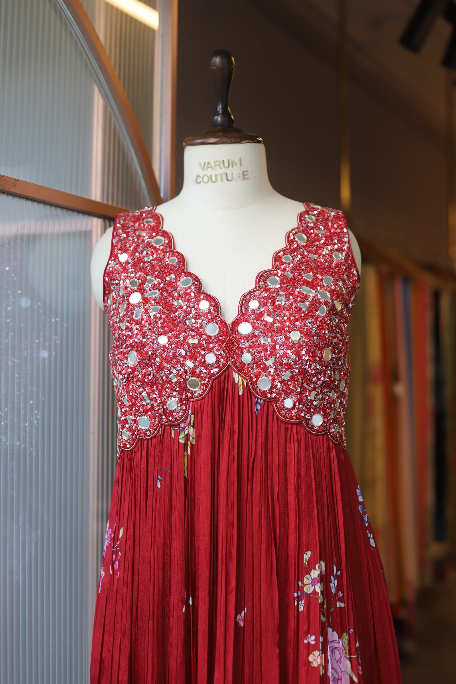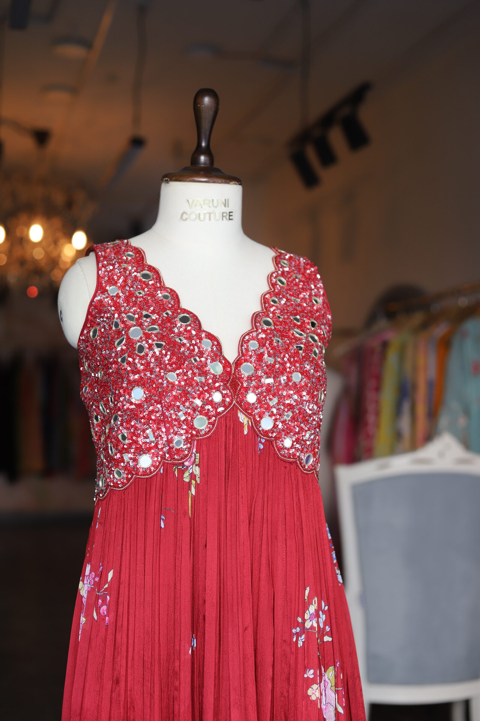 The yoke is exquisitely hand-crafted, adorned with intricate sequence and mirror work, finished with a delicate scalloped design that adds a touch of regal charm.