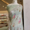 Effortless grace meets modern sparkle. This exquisite Crape chiffon saree features a romantic all-over floral bunch print in soft, ethereal hues. To add a touch of festive glamour, the entire drape is framed by a meticulously handcrafted 4-sided border of sequins and mothi (pearl) work.