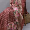 An exquisite Chanderi Bandhani saree crafted for timeless elegance, featuring intricate petit point artistry delicately highlighted on one side of the saree. The flowing drape is enhanced by a beautifully detailed, statement pallu that exudes regal charm. Paired with a refined plain blouse, elegantly finished with a rich zari border on the sleeves, this saree is a perfect blend of heritage craftsmanship and understated luxury—ideal for festive occasions and refined celebrations.