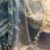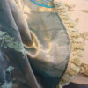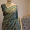 The base color is a translucent teal blue, A beautiful tissue kora with bird pattern embroideries with gap borders in gold is a perfect combination for a graceful look. floral embroidery runs in horizontal patterns across the body, adding a soft decorative touch. The saree is adorned with a rich golden zari border,