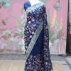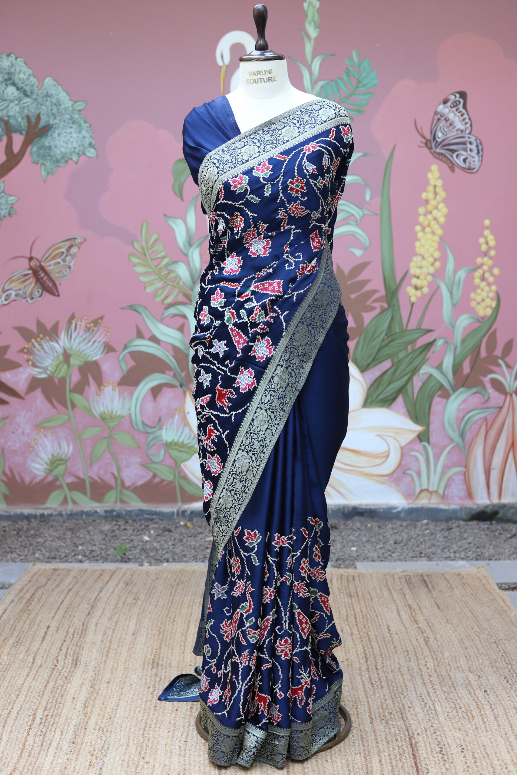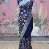 Exquisite pure saree adorned with intricate Aari embroidery across the body, featuring delicate floral and vine motifs. The design is beautifully complemented by a rich Banaras woven border that adds a regal touch. Paired with a plain blouse enhanced with a matching Banaras border for the sleeves, this saree is a perfect blend of traditional craftsmanship and timeless elegance.