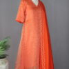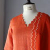 This vibrant orange Kurti exudes elegance with its subtle striped pattern and asymmetrical hem. The delicate white scalloped embroidery along the neckline and edges. Paired with a matching flowing dupatta adorned with wavy white embroidery, it creates a graceful silhouette. The lightweight fabric and airy design make it a perfect blend of comfort and style.