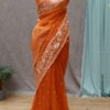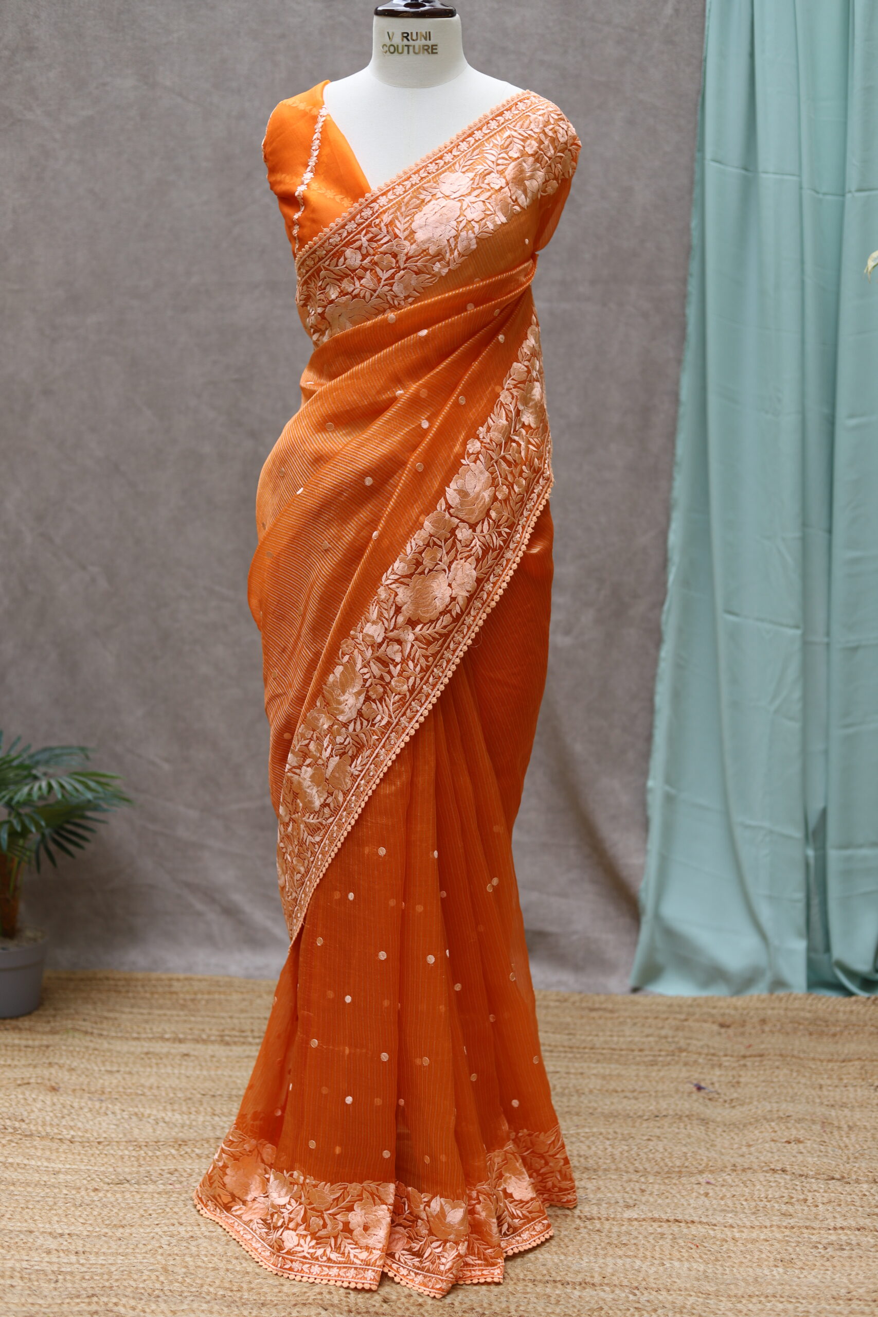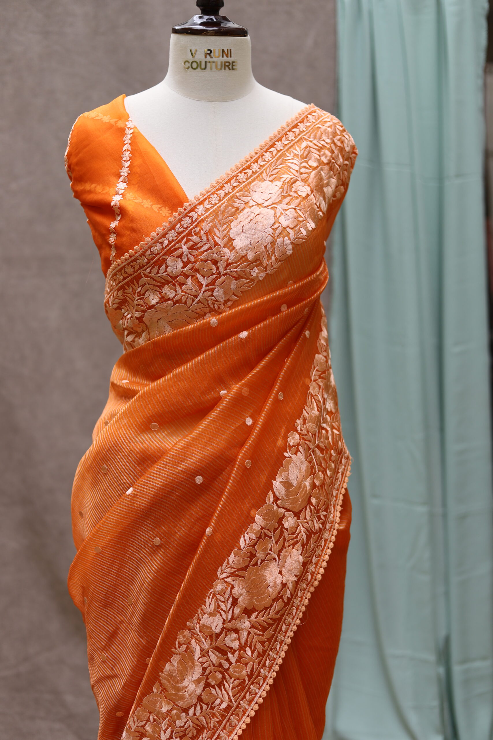 A pure organza saree adorned with mixed tissue strips, featuring delicate thread embroidery along all four sides and scattered intricately across the body. The saree is finished with an elegant crochet border, paired with a pure organza blouse embellished with matching threadwork