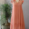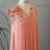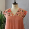 This dress is a flowy, calf-length piece crafted from a light, sheer peach-pink fabric. It features a pleated design that adds soft texture and movement. The bodice has a floral embroidered yoke with delicate multicolored flowers on a similar peach base, complemented by small cap sleeves. The overall look is airy and feminine, blending bohemian charm with an elegant, relaxed silhouette.
