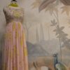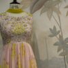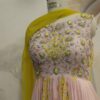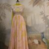 This beautiful long gown features a soft pastel pink base crafted from flowing crape chiffon. The bodice is richly adorned with delicate hand embroidery in floral motifs .The light flare with scattered yellow and pink floral prints, creating a dreamy and youthful vibe. Paired with a contrasting bright yellow dupatta.