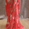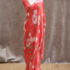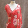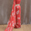 A pure Georgette saree adorned with a graceful all-over floral print, enhanced further with highlighted floral motifs embellished with delicate sequin work. The edges are finished with a beautifully hand-worked scallop detailing, adding a refined charm to the drape. The blouse piece is crafted with intricate sequin work and complemented by scallop-finished sleeves, making it a perfect blend of sophistication and subtle shimmer.