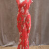 A pure Georgette saree adorned with a graceful all-over floral print, enhanced further with highlighted floral motifs embellished with delicate sequin work. The edges are finished with a beautifully hand-worked scallop detailing, adding a refined charm to the drape. The blouse piece is crafted with intricate sequin work and complemented by scallop-finished sleeves, making it a perfect blend of sophistication and subtle shimmer.