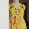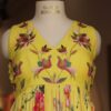 This vibrant long gown comes in a cheerful yellow shade, featuring a flowy and pleated silhouette. It is beautifully printed with multicolored floral patterns that add a fresh and lively touch. The bodice showcases intricate embroidery with bird motifs, enhancing. Sleeveless and elegant, it’s perfect for a bright daytime occasion.