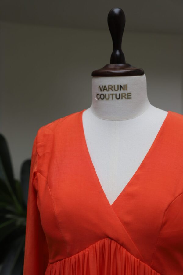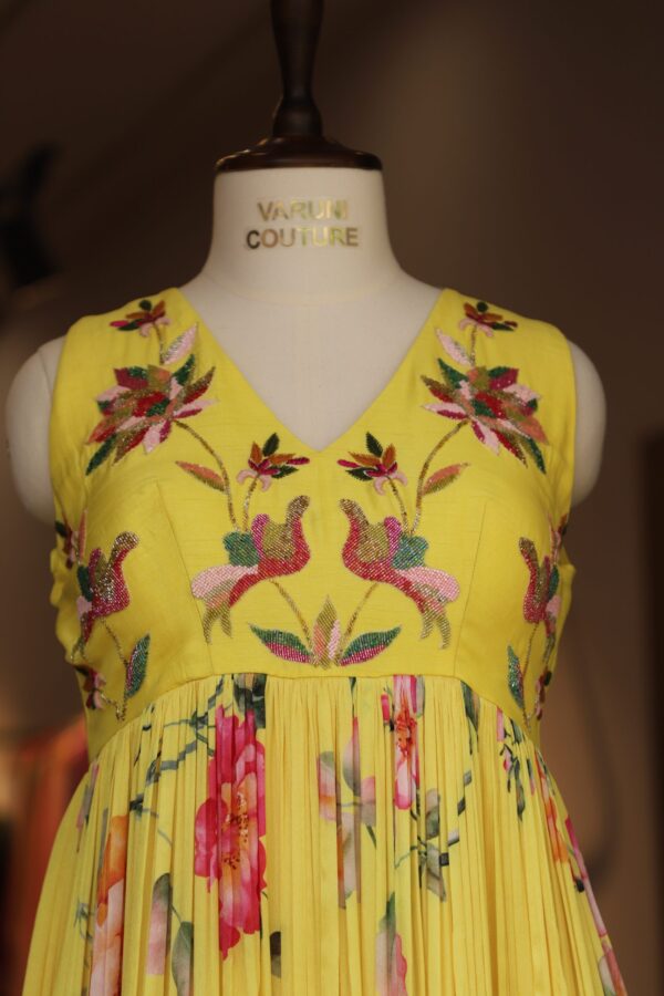 This exquisite long gown comes in a rich fuchsia pink color, crafted from lightweight georgette fabric that flows gracefully to the floor. The bodice is beautifully highlighted with intricate gold thread embroidery in a delicate leafy pattern, starting from the V-neckline and extending along the bust, creating a luxurious frame. Full-length sheer sleeves add an ethereal look, adorned with matching golden embroidery on the cuffs for a cohesive design.
